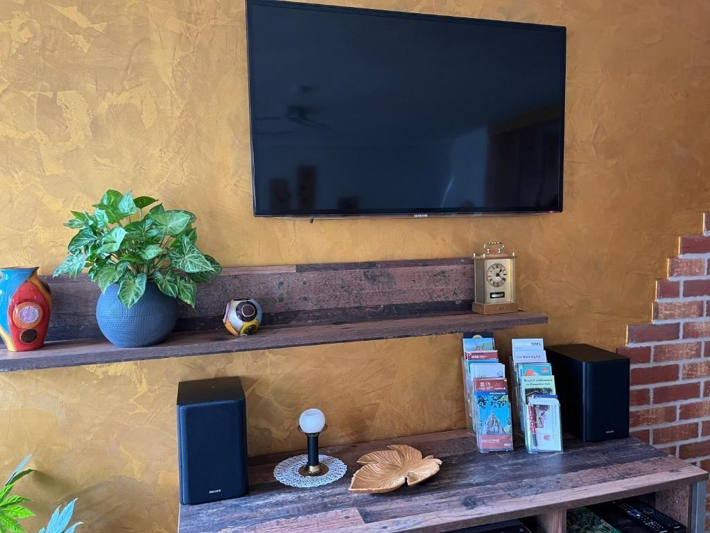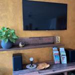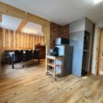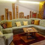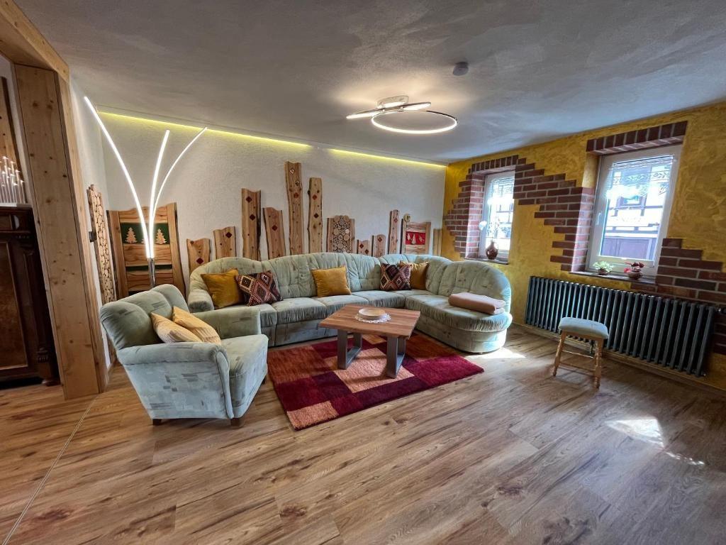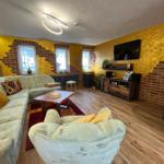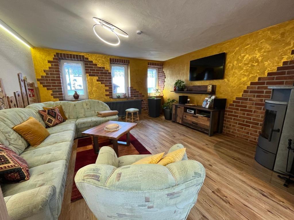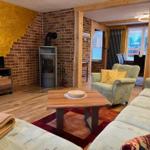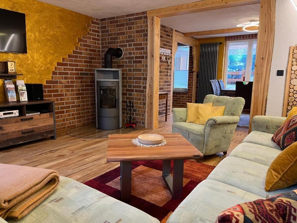 Im Wohnzimmer lädt eine Eckcouch mit Sessel und Blick auf den Kaminofen zum Entspannen ein – ideal für gemütliche Abende mit Musik oder Fernsehen.