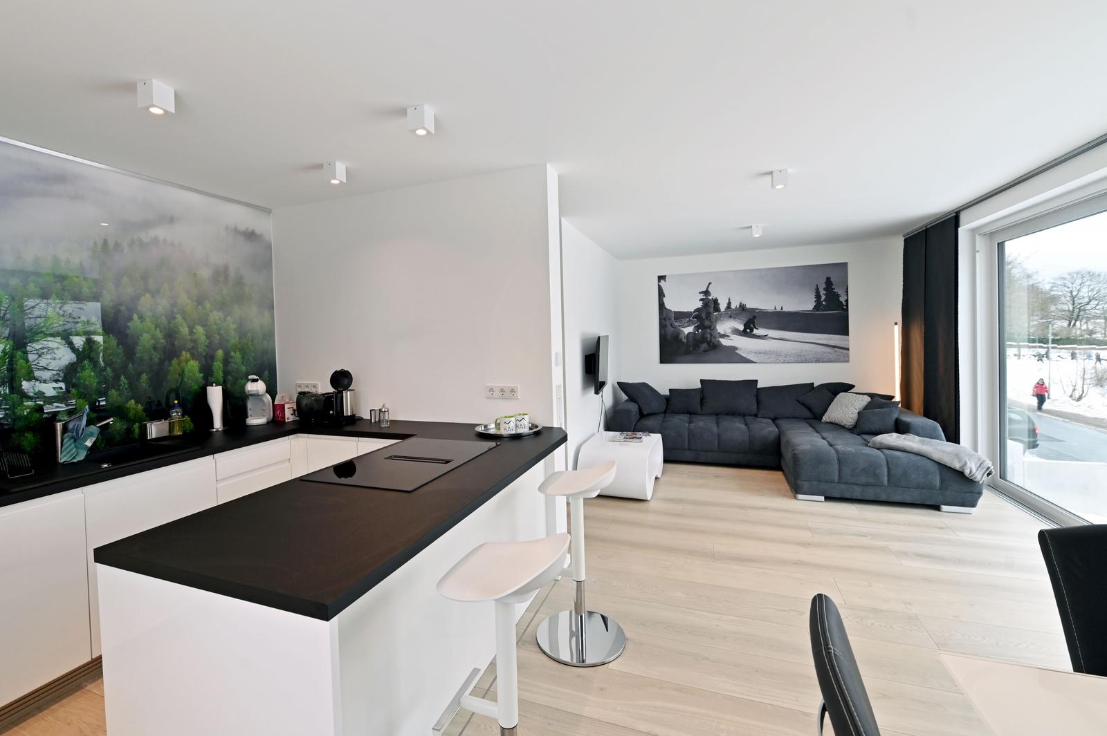 Die Essecke mit Kinderhochstuhl grenzt an die offene Küche, an dessen Tresen man auf Barhockern am Morgen den herrlichen Sonnenaufgang über Sankt Andreasberg bestaunen kann.