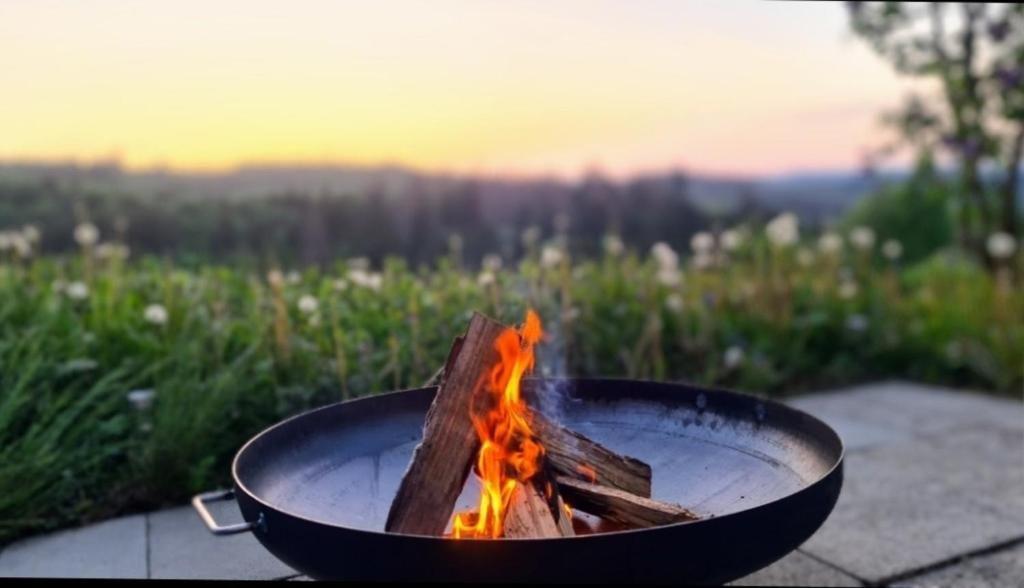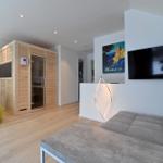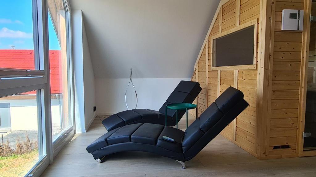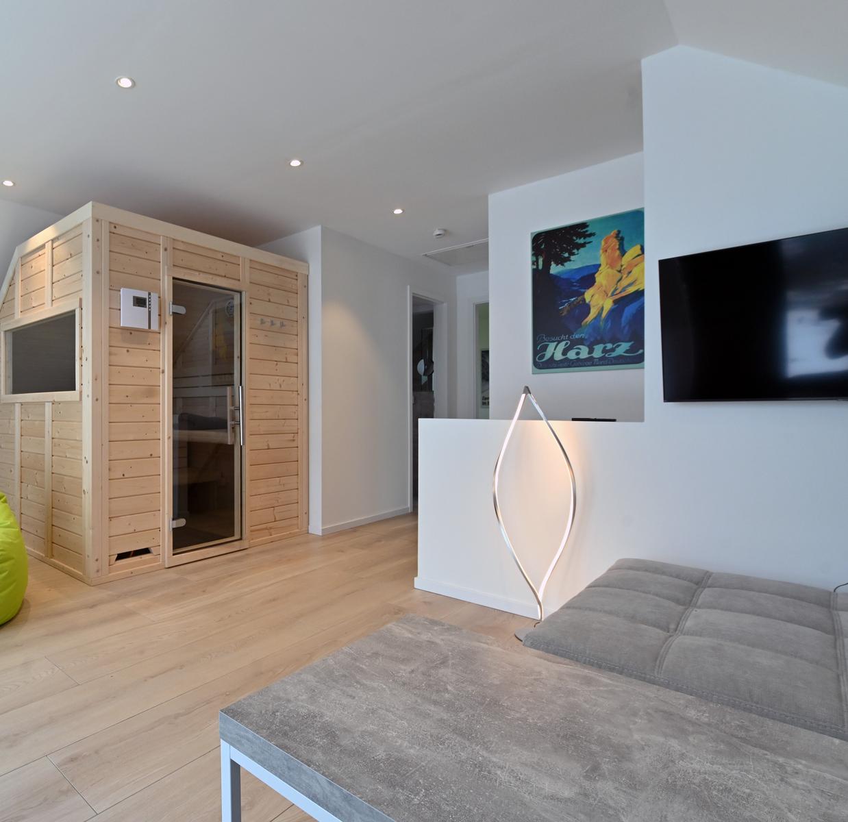Im Obergeschoss gelangt man in unsere großzügige Galerie mit einem weiteren gemütlichen Schlafsofa, einem Smart- TV, zwei Relax- Liegen und unserer Sauna, durch dessen Fenster man das Harzer Bergpanorama bestaunen kann.