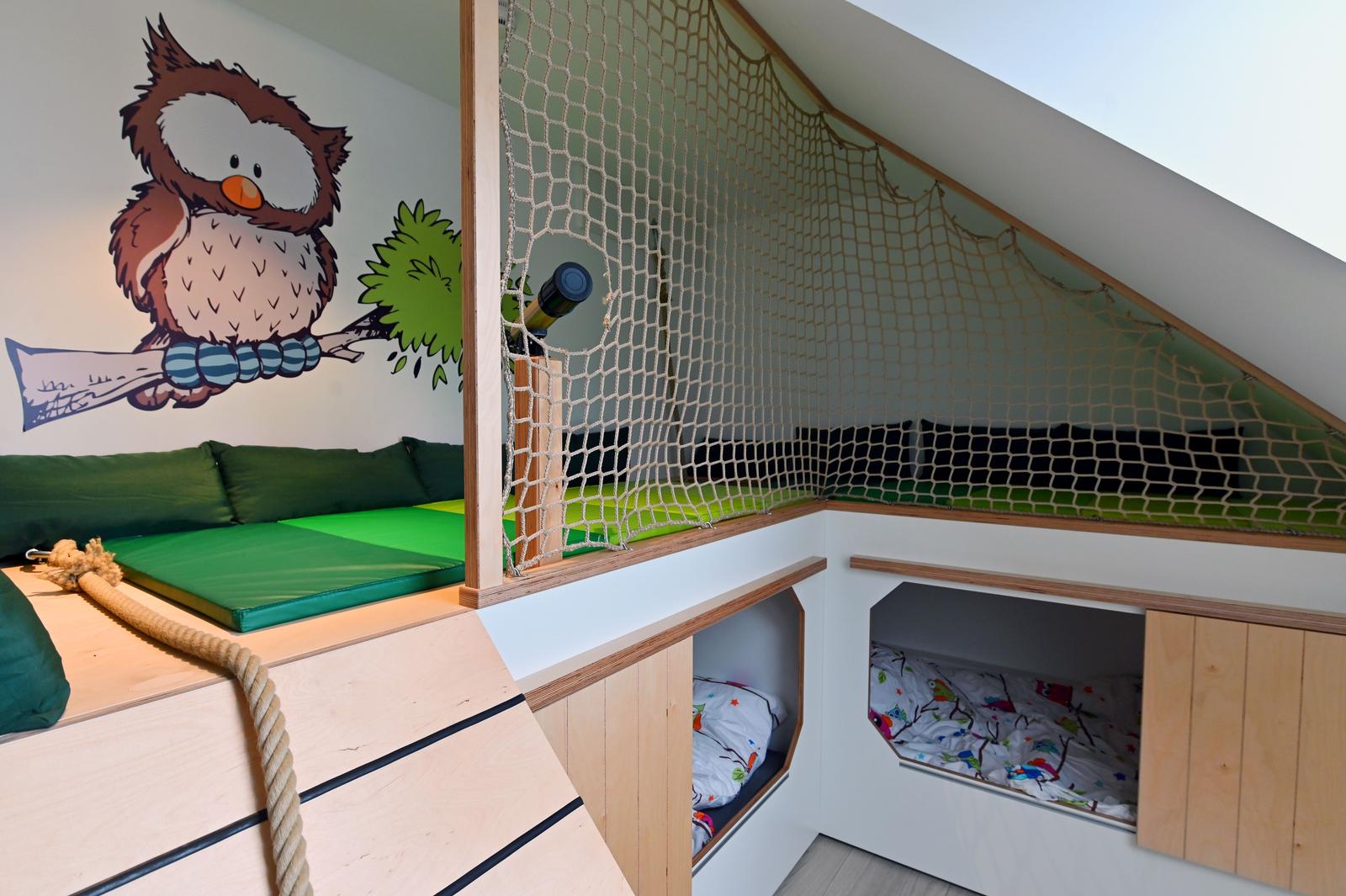 Nebenan können sich die Kinder auf dem Spiel- und Abenteuerbett austoben und um sich abends müde und zufrieden in den Schlafhöhlen einzukuscheln.