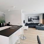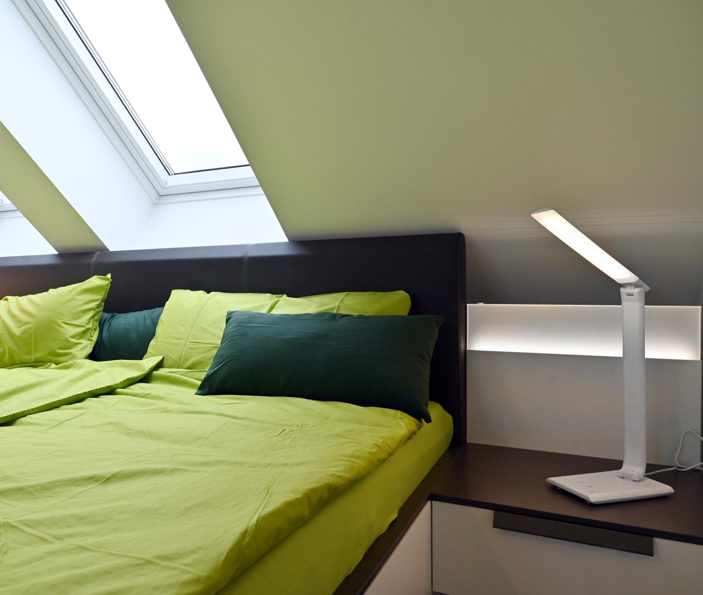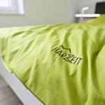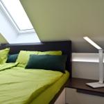 Angrenzend befindet sich ein Schlafzimmer mit Doppelbett, Nachttischlampen mit USB Ladegerät, ein großzügiger Schwebetürschrank und ein Smart TV.