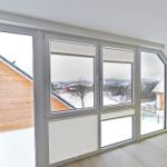 Von der Küche aus blickt man auf die Sonnenterrasse, die durch eine große Panorama- Verandatür vom Wohnbereich getrennt ist.