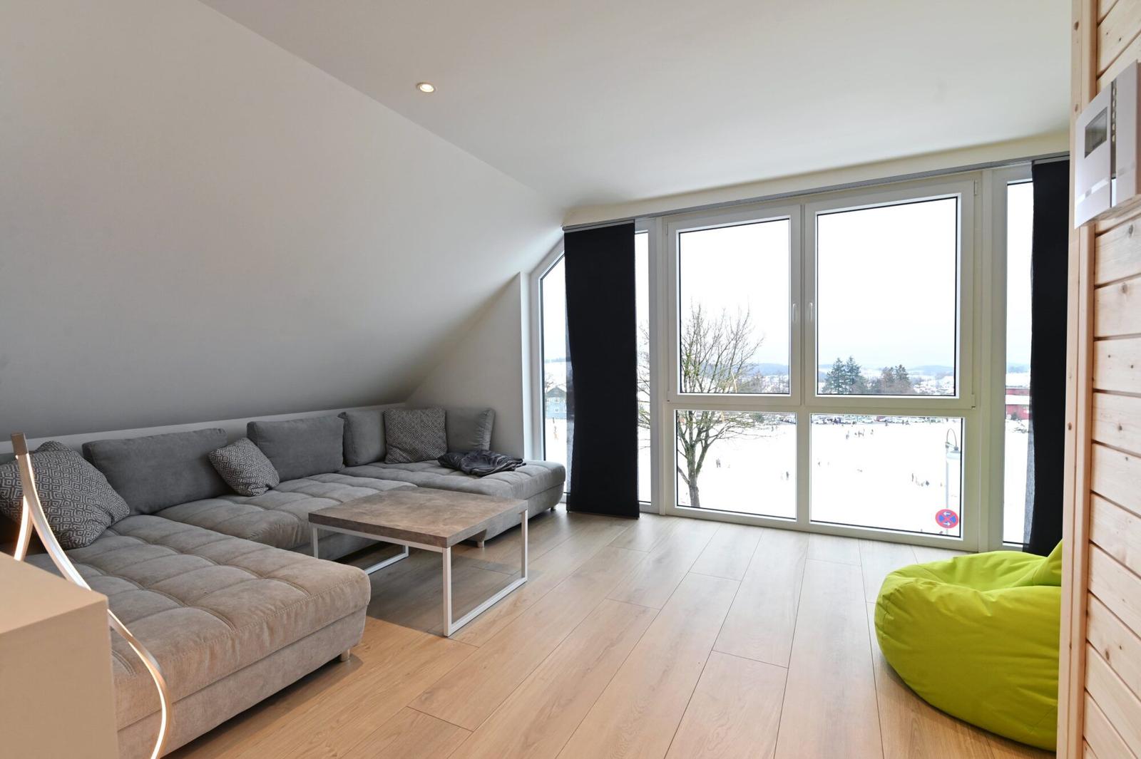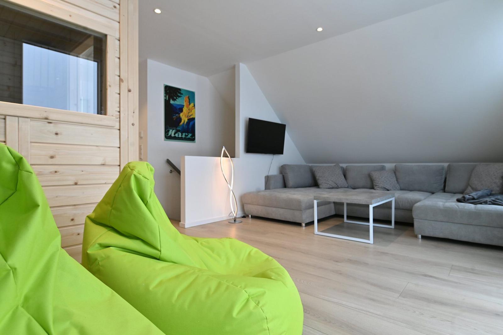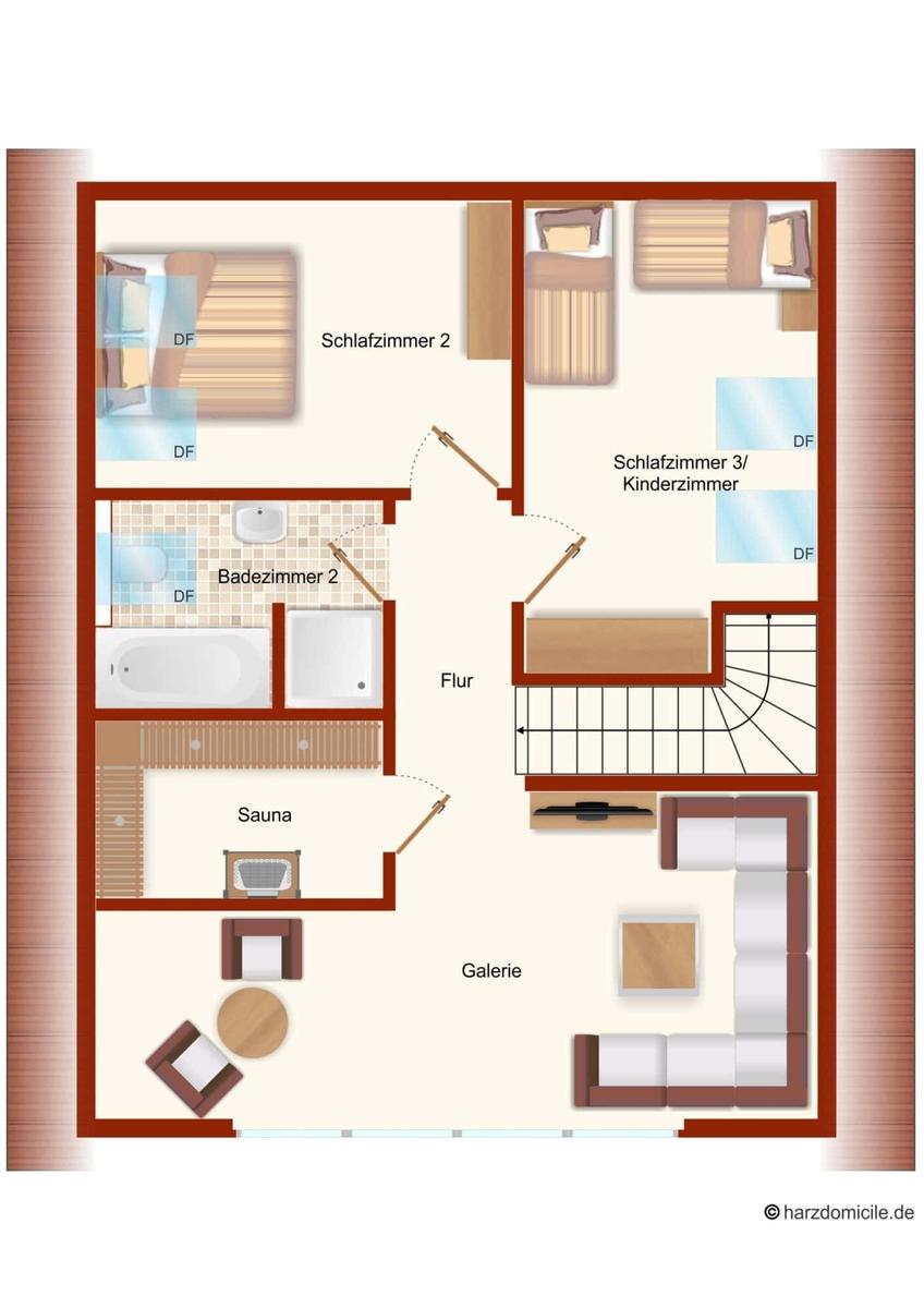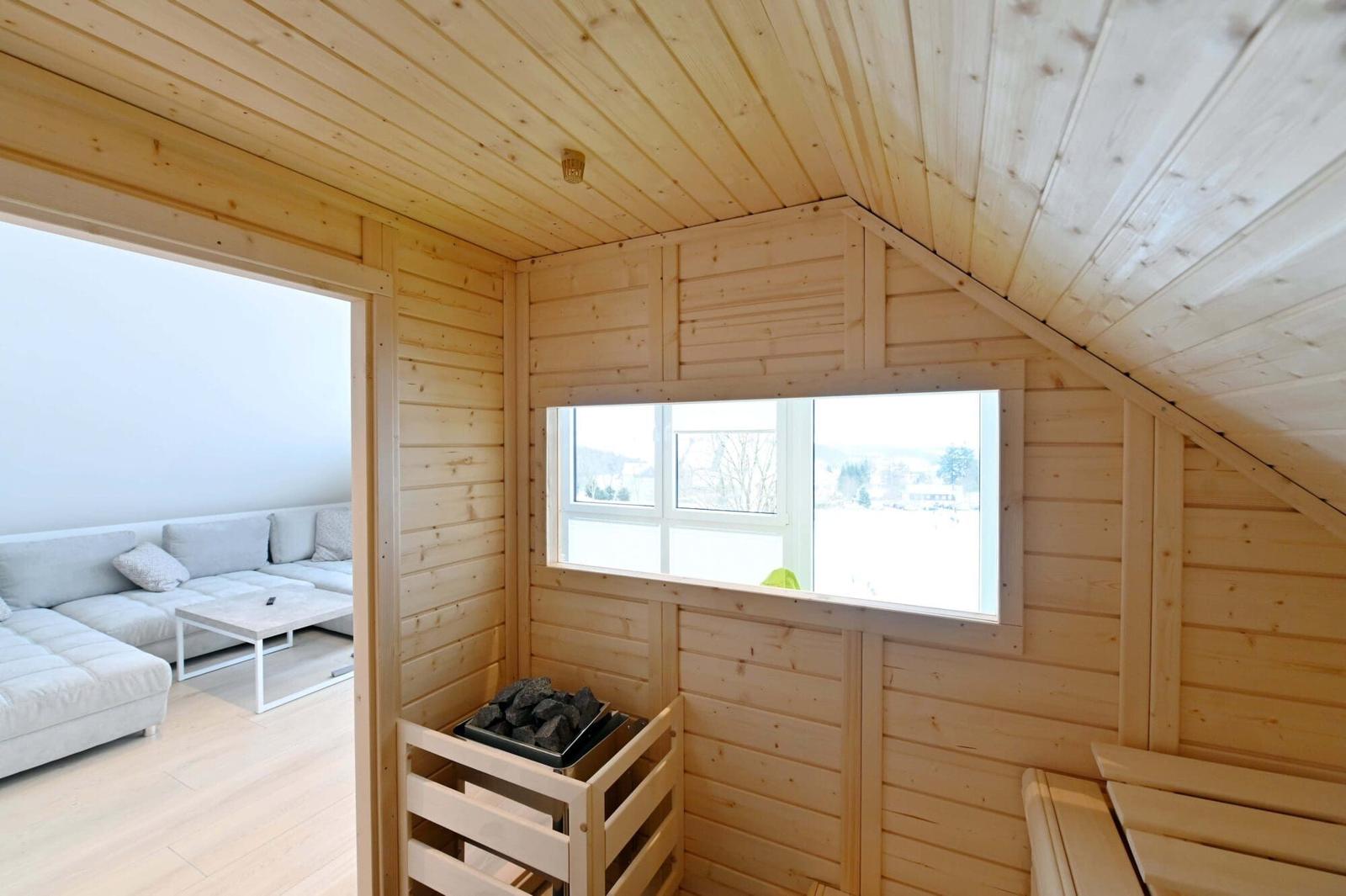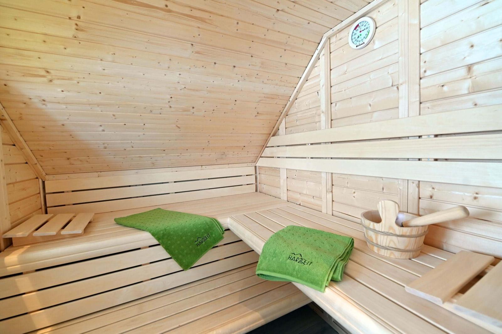 Im Obergeschoss gelangt man in unsere großzügige Galerie mit einem weiteren gemütlichen Schlafsofa, einem Smart- TV, zwei Relax- Liegen und unserer Sauna, durch dessen Fenster man das Harzer Bergpanorama bestaunen kann.
