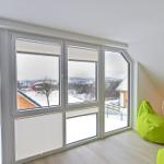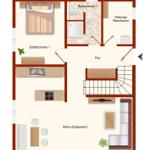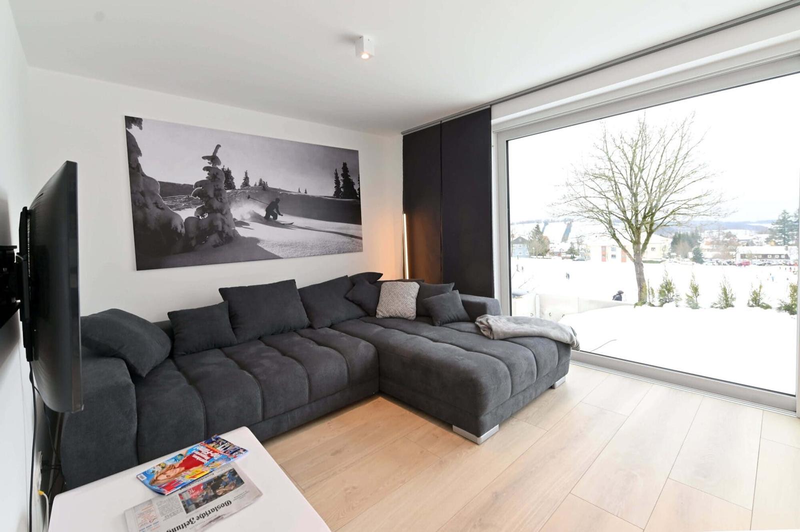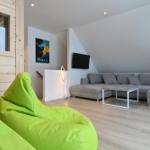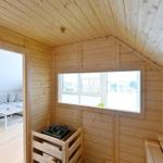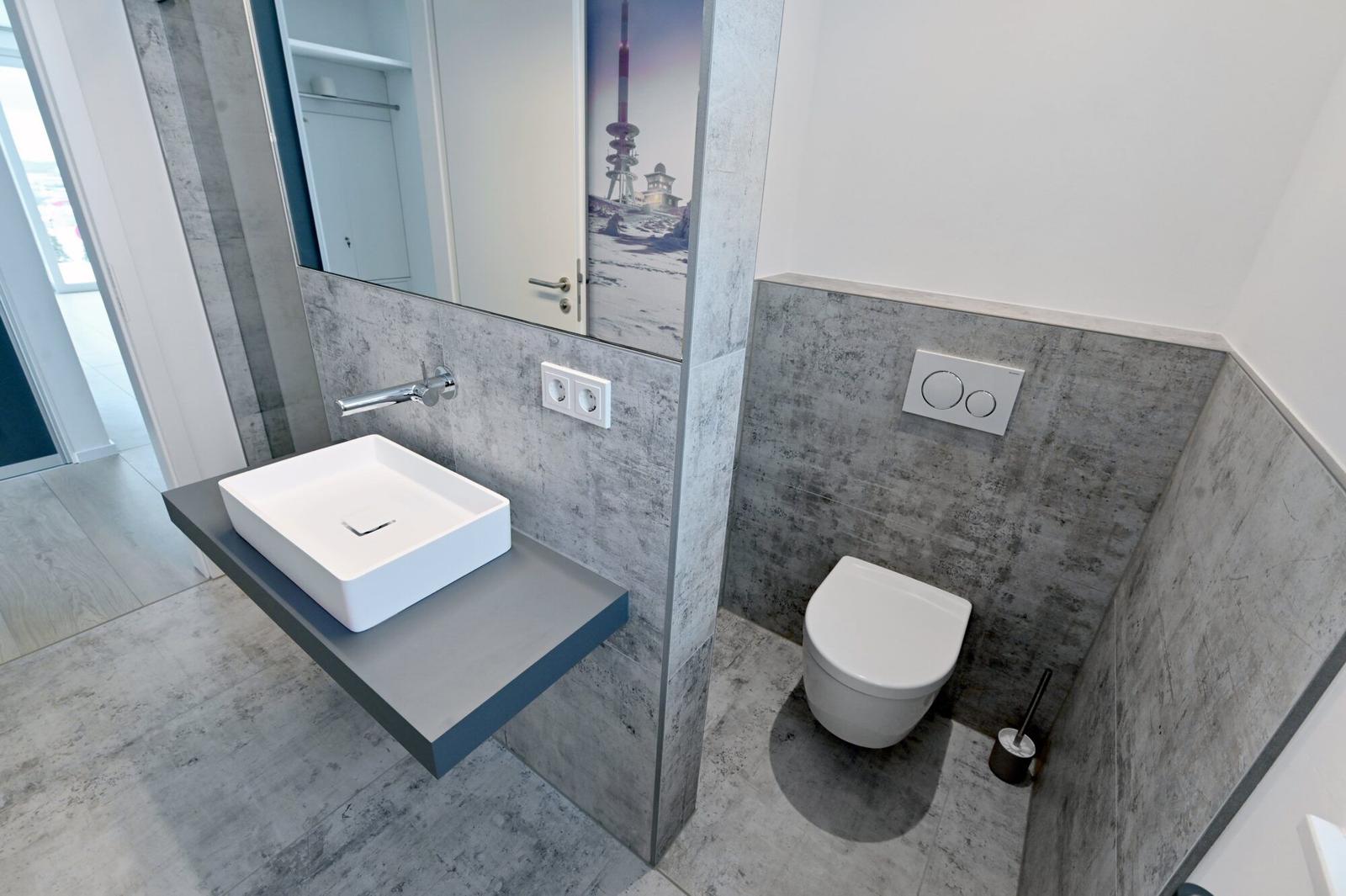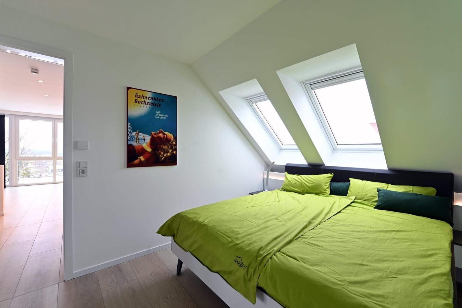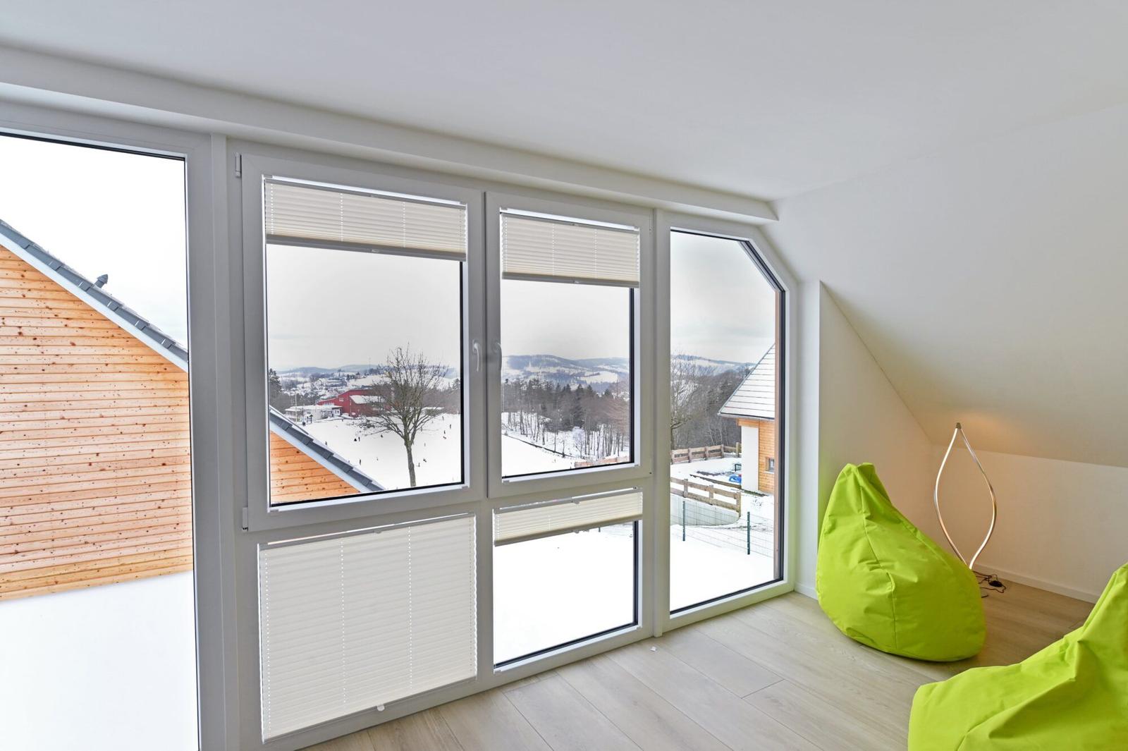 Im Obergeschoss gelangt man in unsere großzügige Galerie mit einem weiteren gemütlichen Schlafsofa, einem Smart- TV, zwei Relax- Liegen und unserer Sauna, durch dessen Fenster man das Harzer Bergpanorama bestaunen kann.