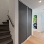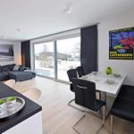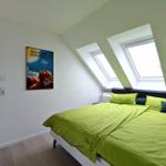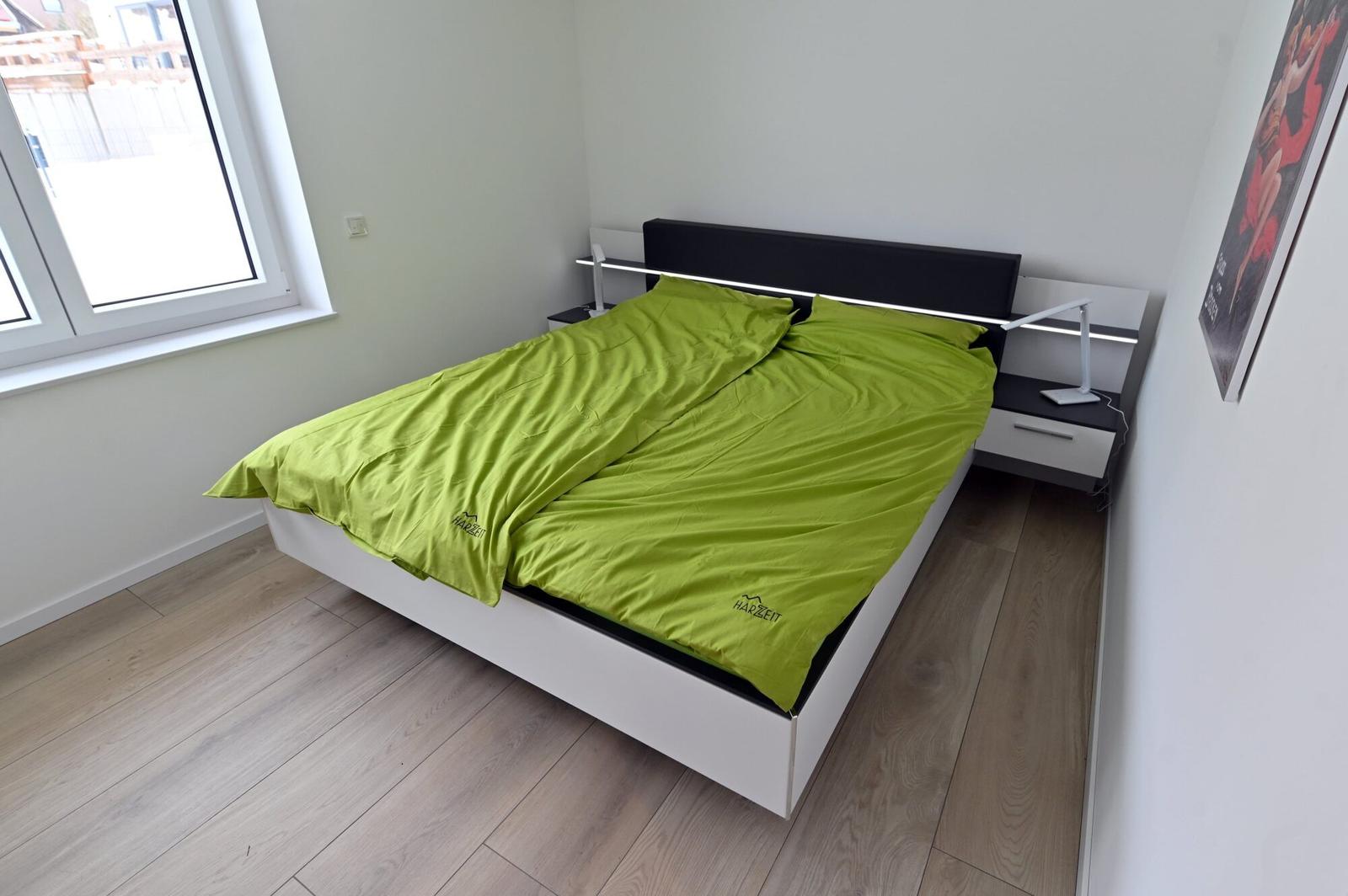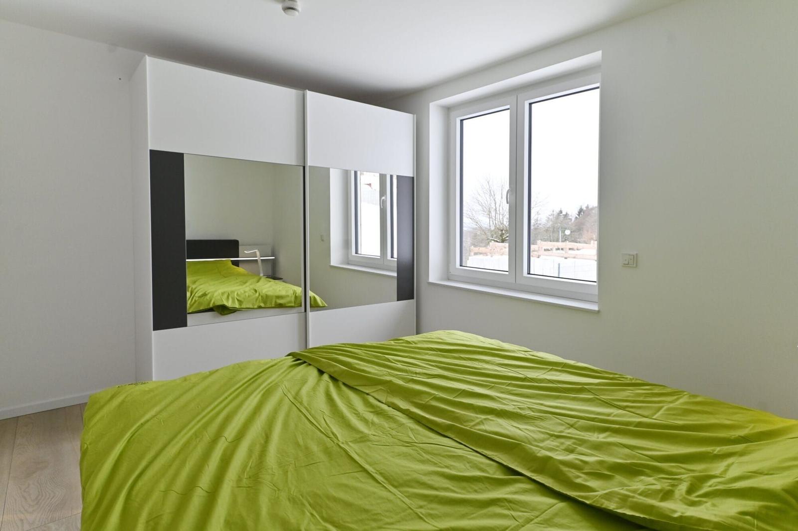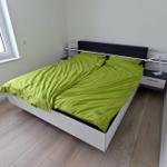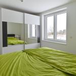 Angrenzend befindet sich ein Schlafzimmer mit Doppelbett, Nachttischlampen mit USB Ladegerät, ein großzügiger Schwebetürschrank und ein Smart TV.