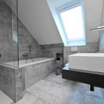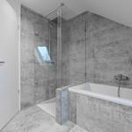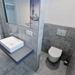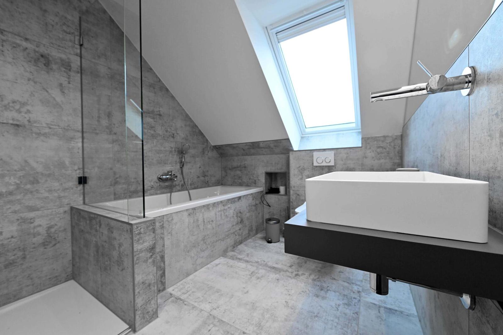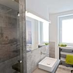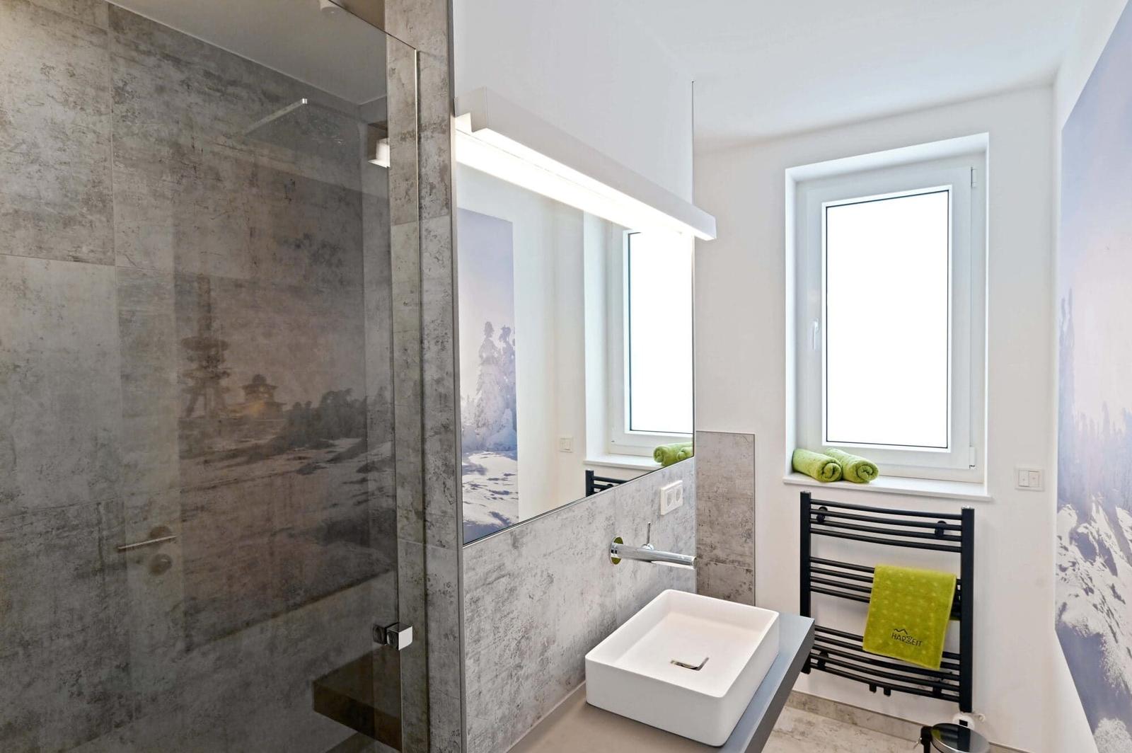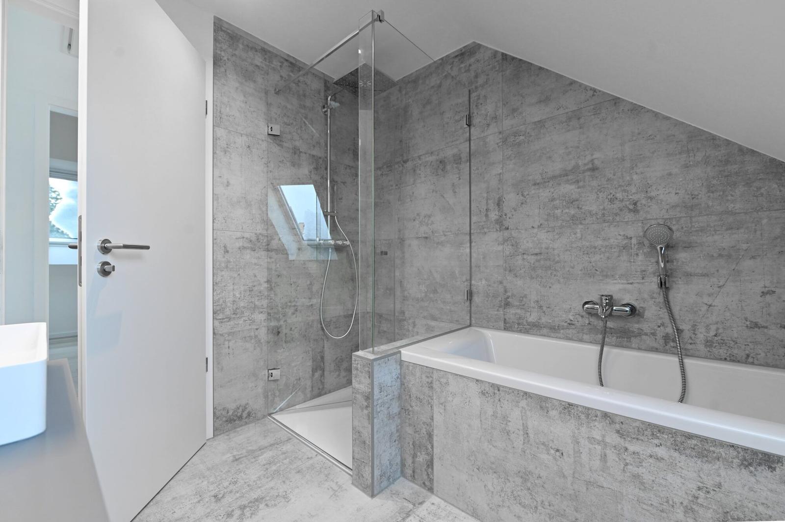Vis a vis befindet sich das zweite Badezimmer mit Badewanne, Glasdusche, Kosmetikspiegel und Föhn.