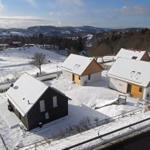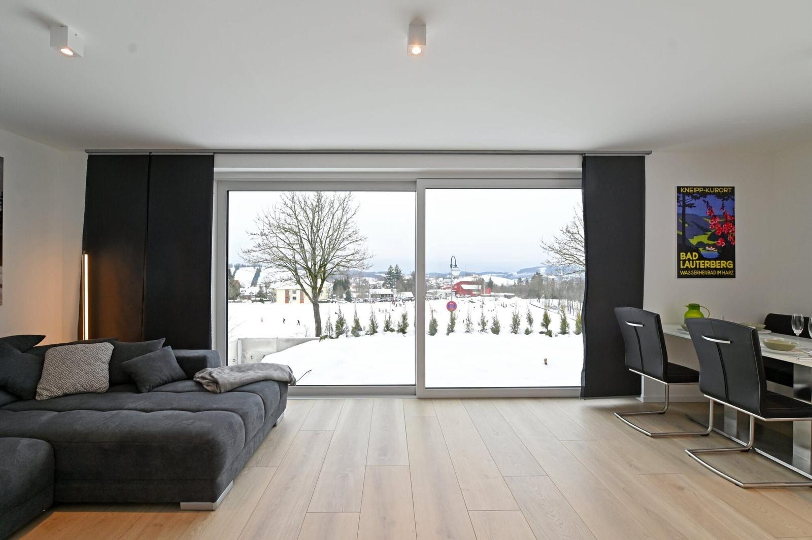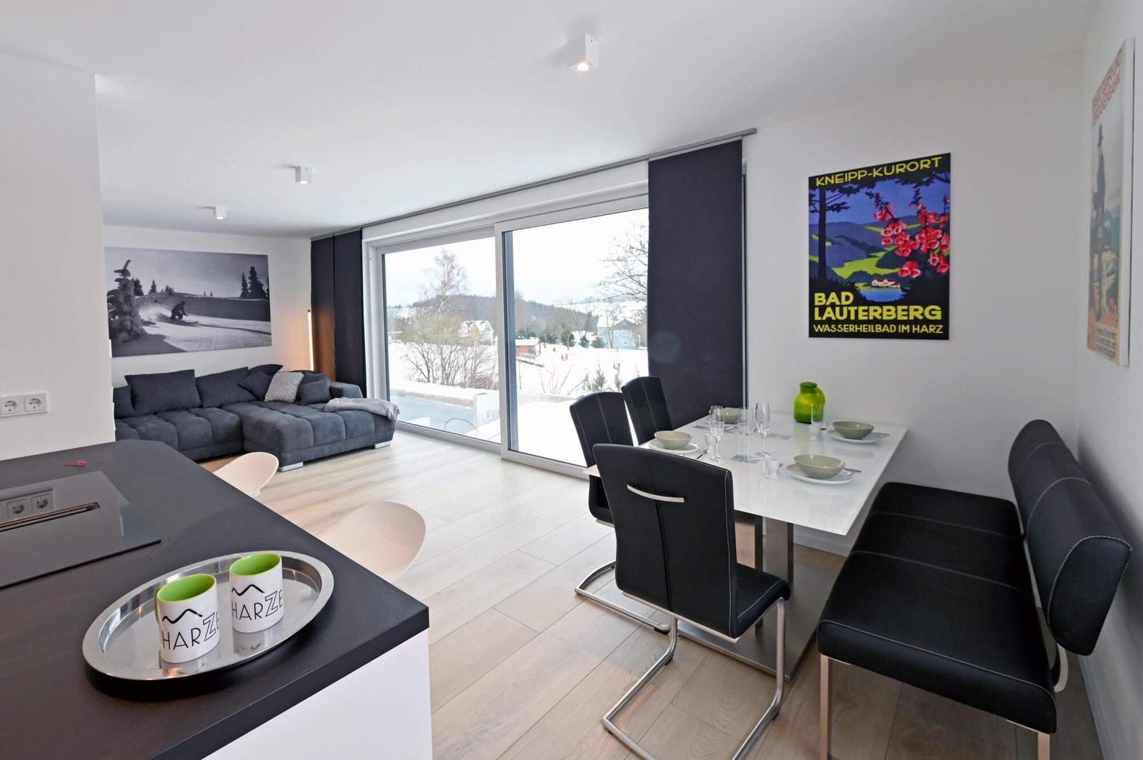 Die Essecke mit Kinderhochstuhl grenzt an die offene Küche, an dessen Tresen man auf Barhockern am Morgen den herrlichen Sonnenaufgang über Sankt Andreasberg bestaunen kann.