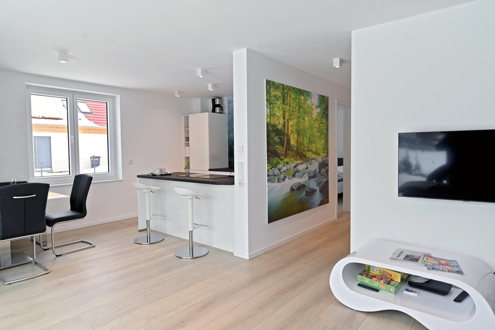Im Erdgeschoss befindet sich der lichtdurchflutete Wohn- und Essbereich mit einem gemütlichen Big Sofa, auf dem man auch herrlich schlafen kann, ein Smart TV und ein (Internet)Radio mit Bluetooth Lautsprecher.