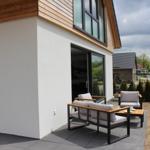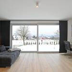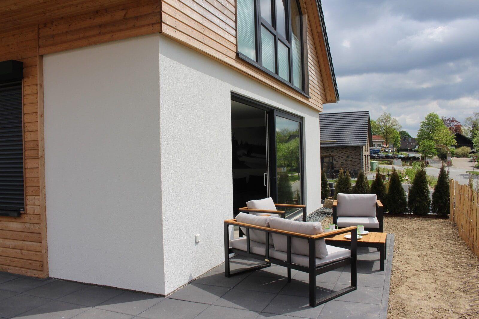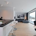 Von der Küche aus blickt man auf die Sonnenterrasse, die durch eine große Panorama- Verandatür vom Wohnbereich getrennt ist.
