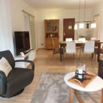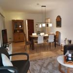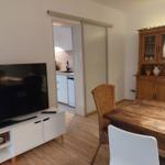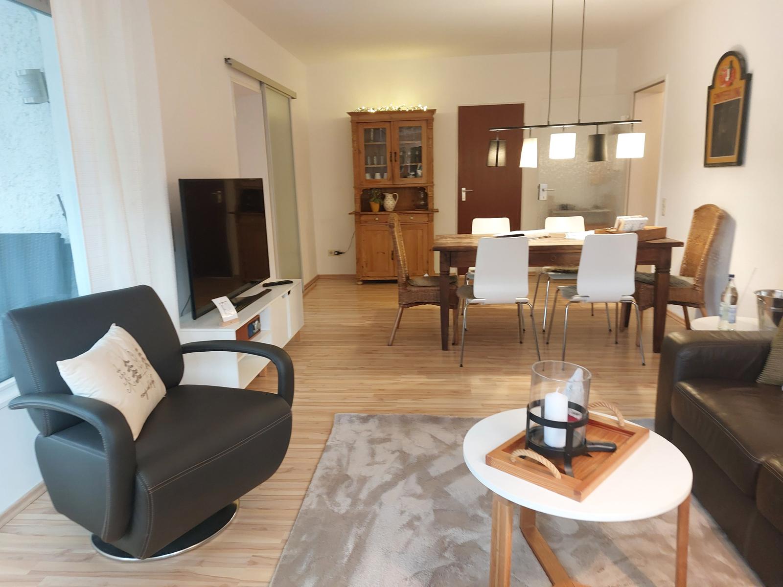 Im geräumigen Wohn- und Esszimmer finden Sie einen Esstisch für bis zu sechs Personen, ideal für gemeinsame Mahlzeiten oder gemütliche Abende. Ein Smart-TV sorgt für Unterhaltung, während das gemütliche Sofa und zwei bequeme Sessel zum Entspannen einladen.