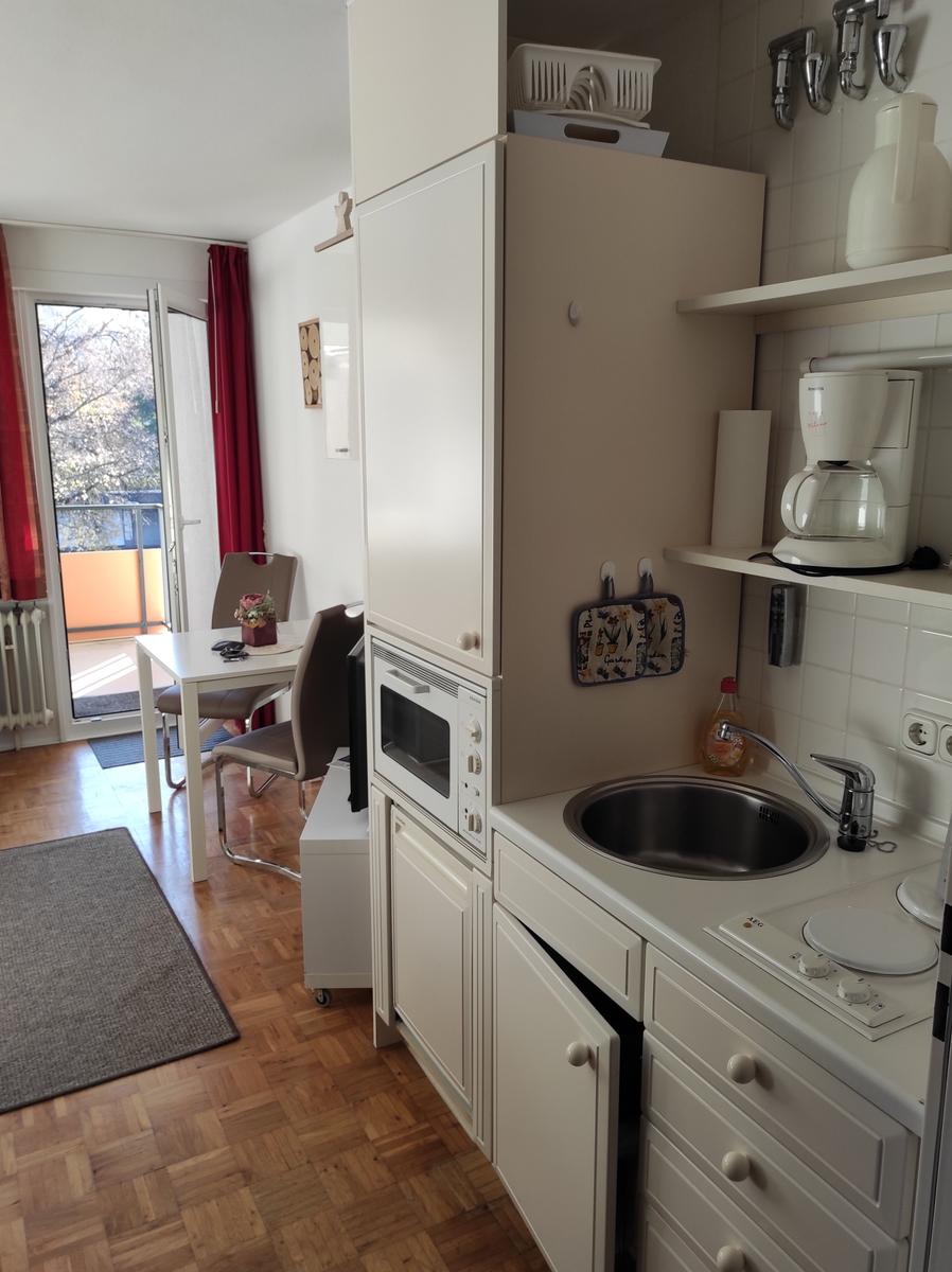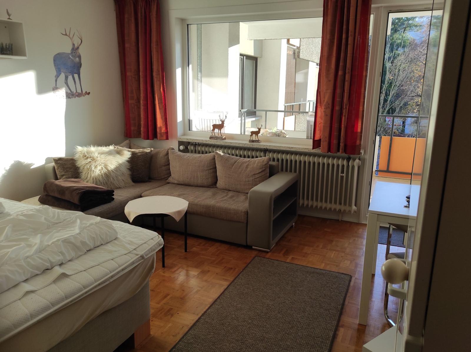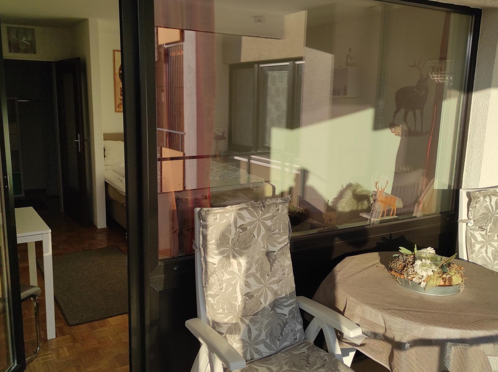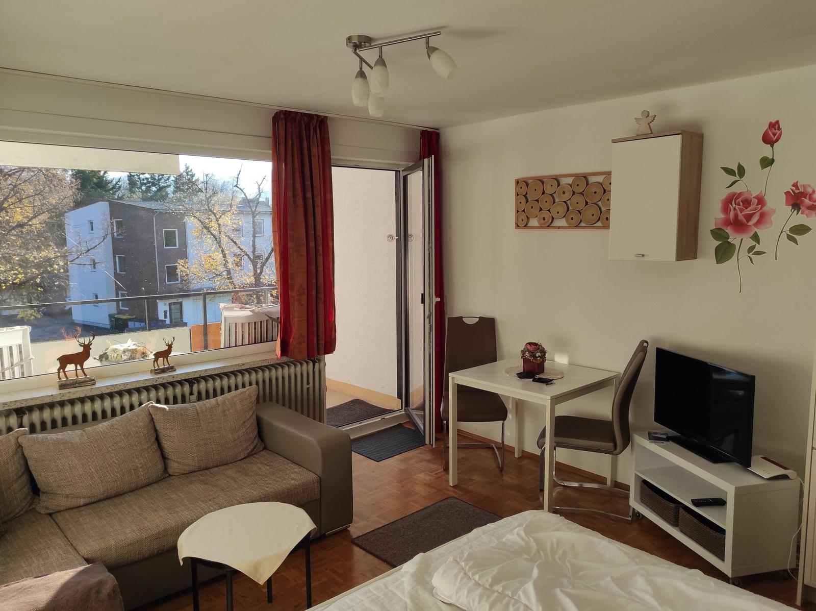 Im lichtdurchfluteten Wohnbereich können Sie auf dem bequemen Sofa entspannen und den Tag bei einem Film auf dem TV ausklingen lassen. Von hier aus gelangen Sie direkt auf den Balkon, der einen schönen Blick ins Grüne bietet und zu entspannten Stunden im Freien einlädt.