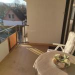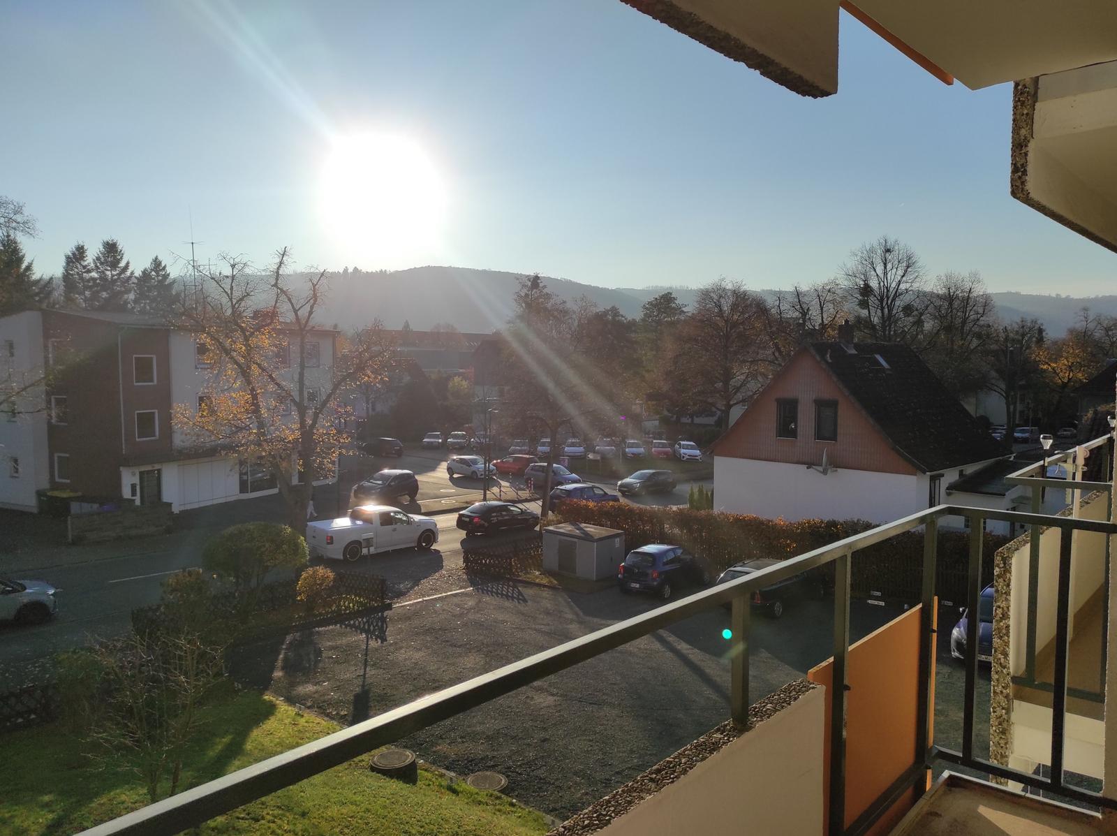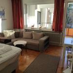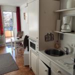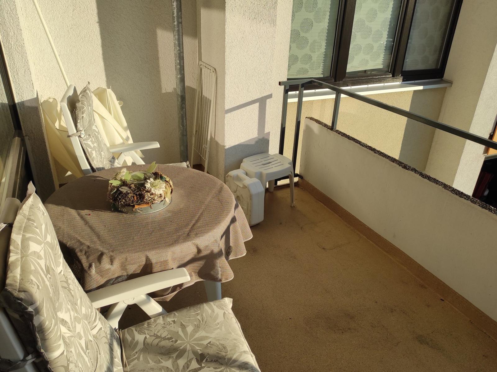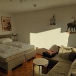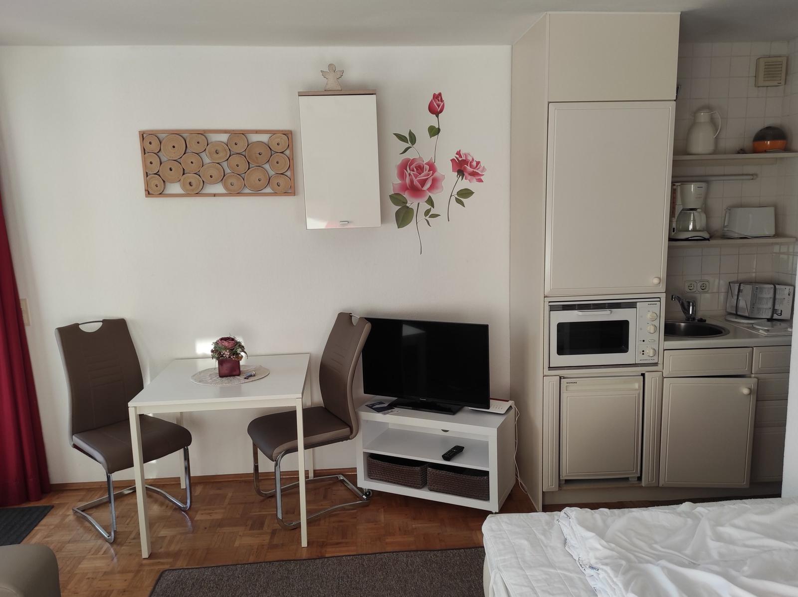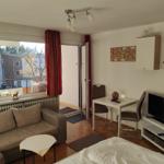 Im lichtdurchfluteten Wohnbereich können Sie auf dem bequemen Sofa entspannen und den Tag bei einem Film auf dem TV ausklingen lassen. Von hier aus gelangen Sie direkt auf den Balkon, der einen schönen Blick ins Grüne bietet und zu entspannten Stunden im Freien einlädt.