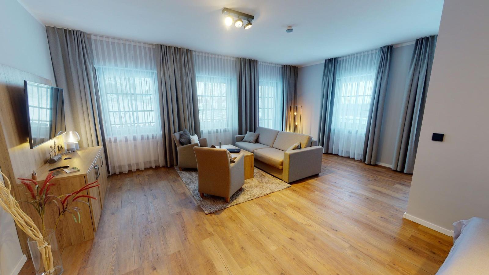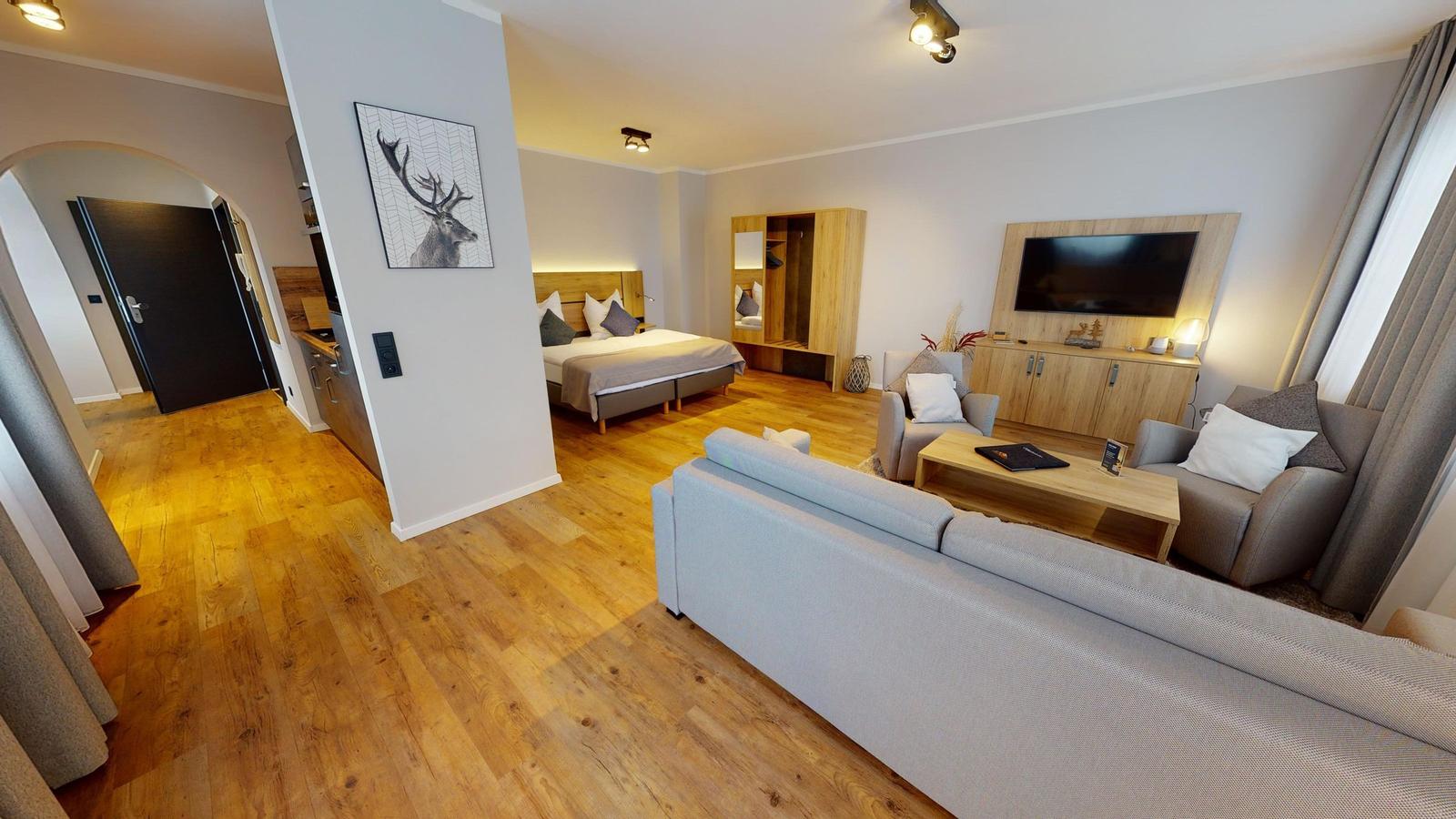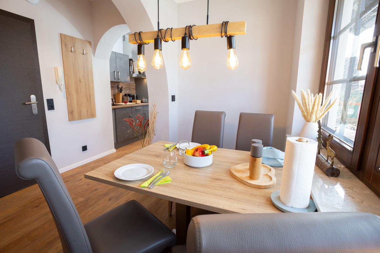 Entdecke das familienfreundliche Studio 5 im Chalet Bergzeit: Platz für bis zu 4 Personen, eine voll ausgestattete Küche, ein großer Balkon und Abenteuer direkt vor der Tür im malerischen Harz!