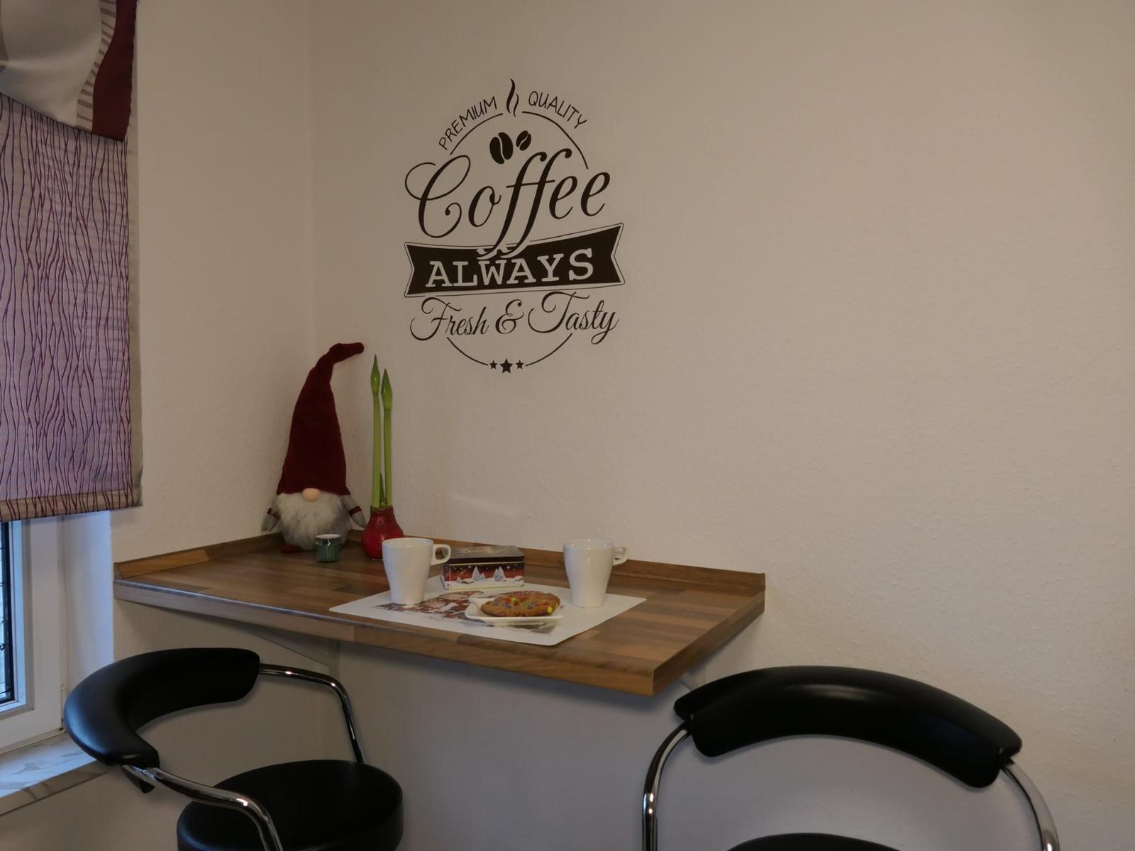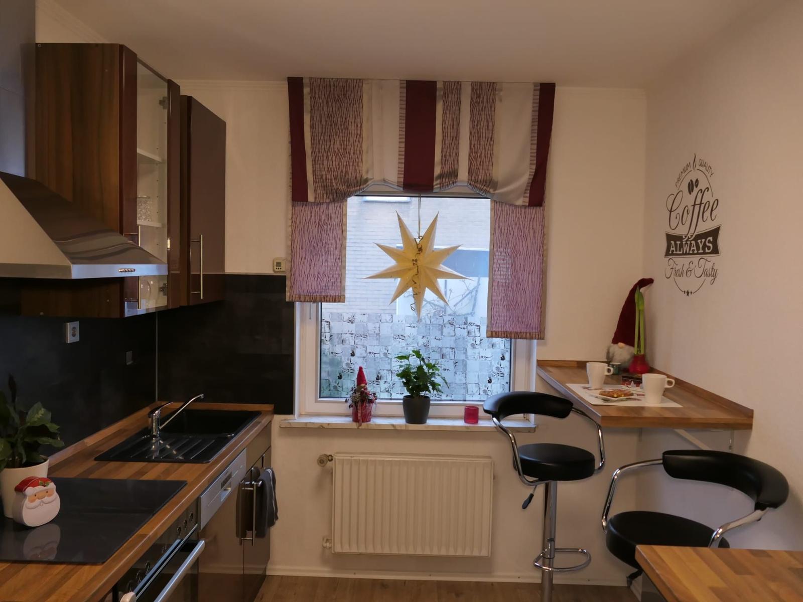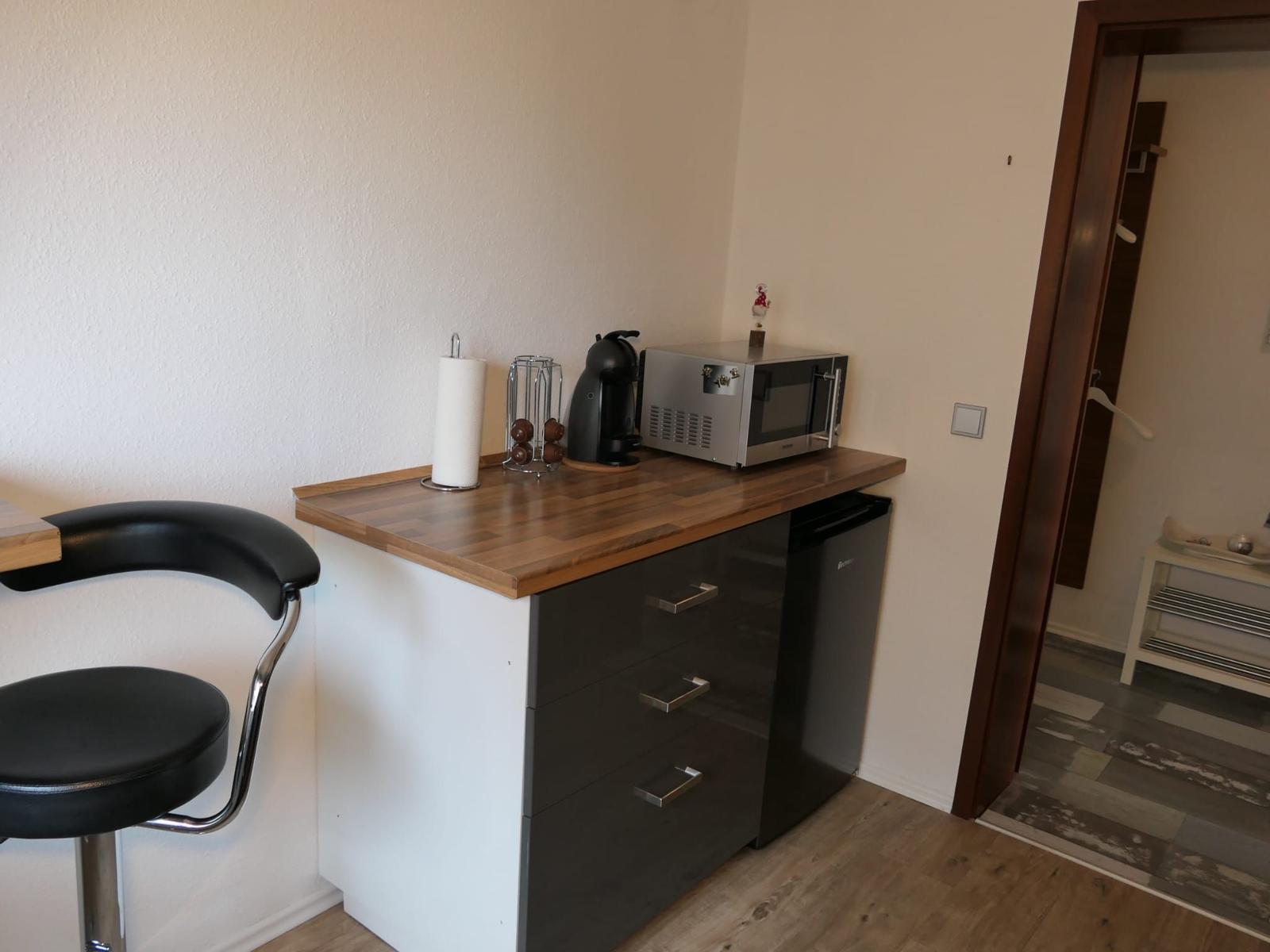 Das gemütliche Sofa lädt für ruhige Momente zum verweilen ein und lässt sich bei Bedarf für bis zu 2 Personen als Schlafsofa umfunktionieren. Die funktionelle moderne Küche verfügt über einen Herd mit Ceranfeld , Mikrowelle , Kaffeemaschine , Kaffee Pad Maschine ,
