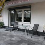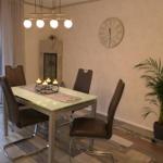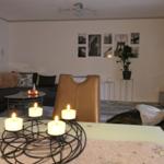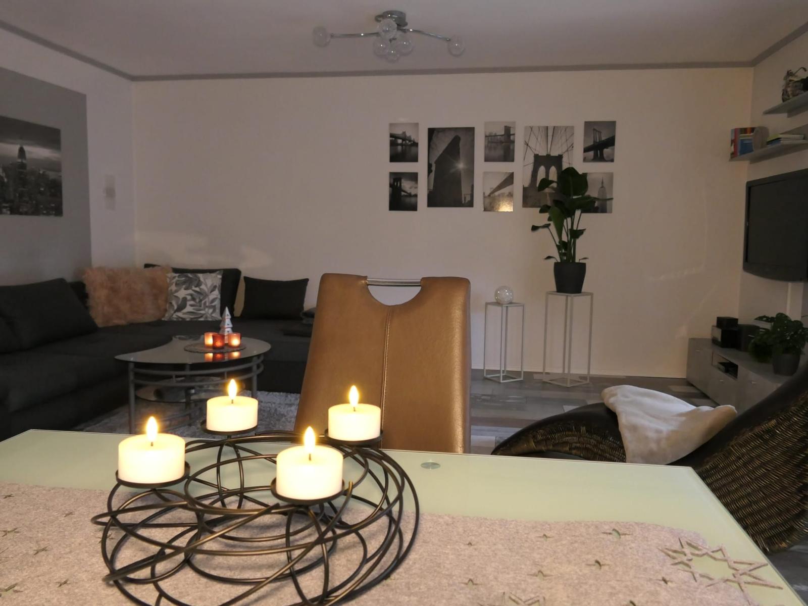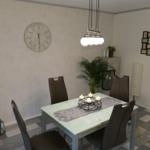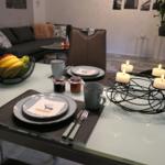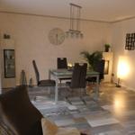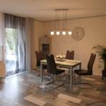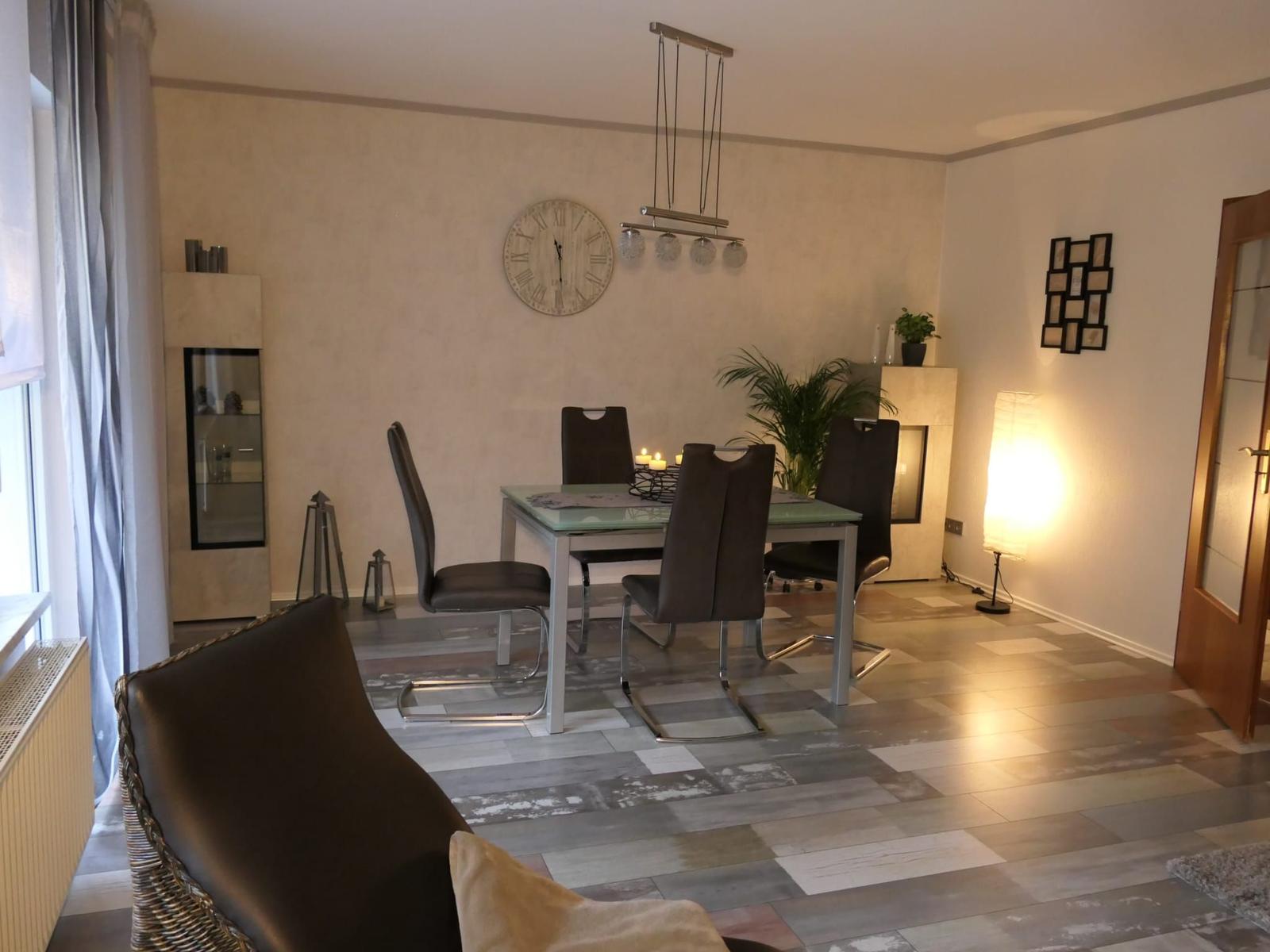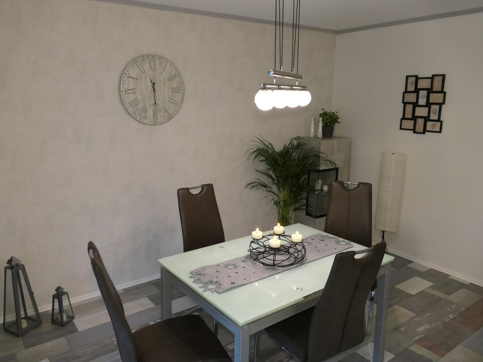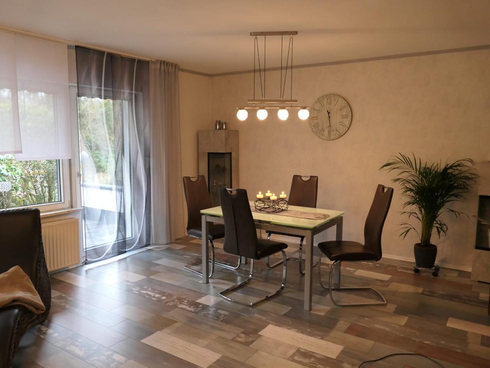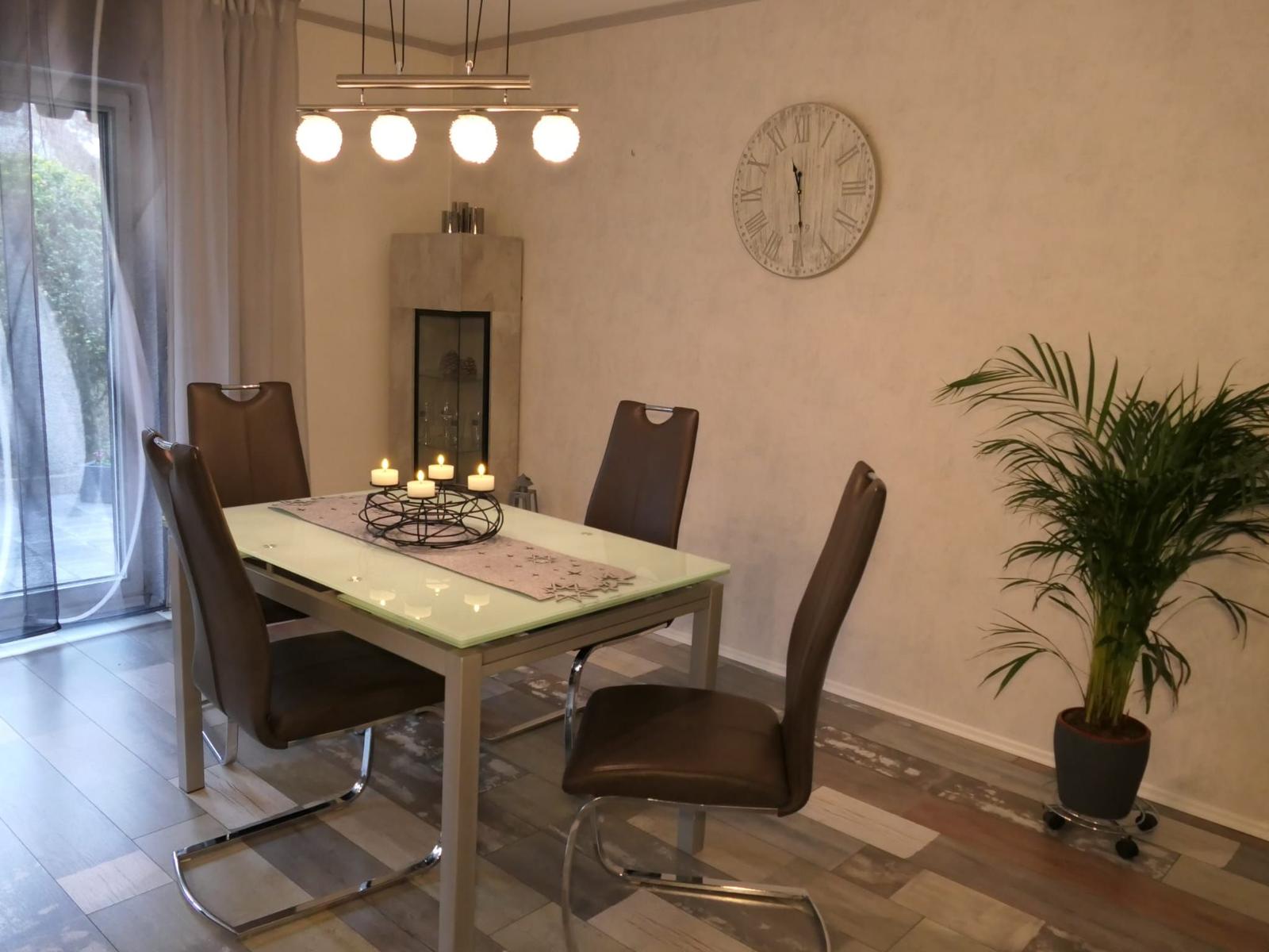 Das geräumige und modern eingerichtete Wohn/Esszimmer mit direktem Zugang zur teilüberdachten Terrasse verfügt über ein SAT TV und einer Stereoanlage.
