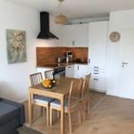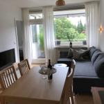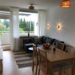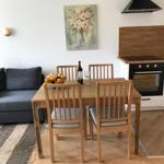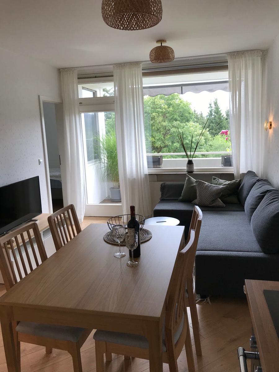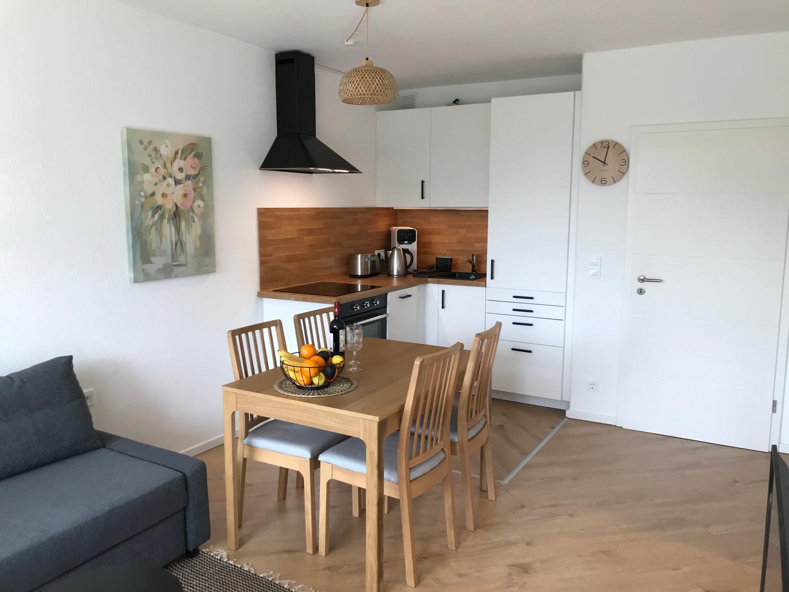 Wohn-/Essbereich: Helles, sonnendurchflutetes Wohnzimmer mit gemütlicher Sitzecke (Schlafcouch), Essplatz und voll ausgestatteter Küche.