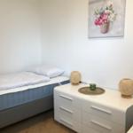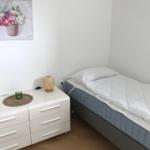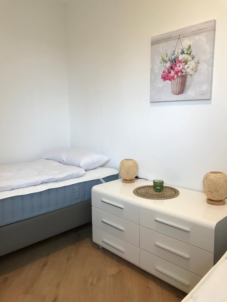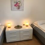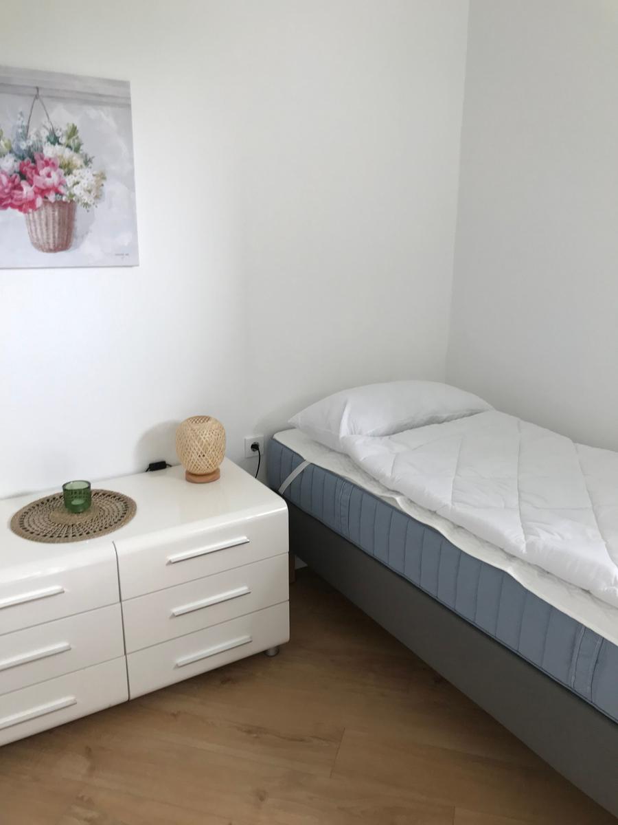 Schlafzimmer: Zwei komfortable Einzelbetten – mit Aussicht ins Grüne.