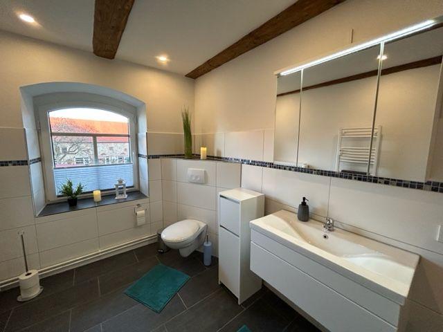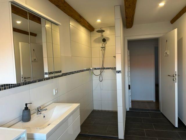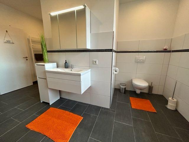 Das moderne Badezimmer verfügt über eine geräumige Dusche, WC, Waschbecken und Fön. Frische Handtücher sowie erste Toilettenartikel sind bei Ihrer Ankunft bereitgestellt.