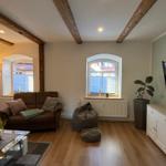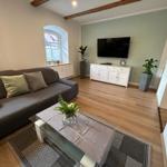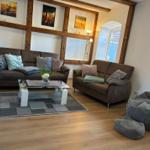 Ein großzügiger, heller Raum mit bequemer Sitzgarnitur und großem Smart-TV, DVD-Player, perfekt für entspannte Abende. Bücher und Spiele für gemeinsame Abende sind ebenfalls vorhanden.