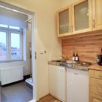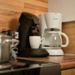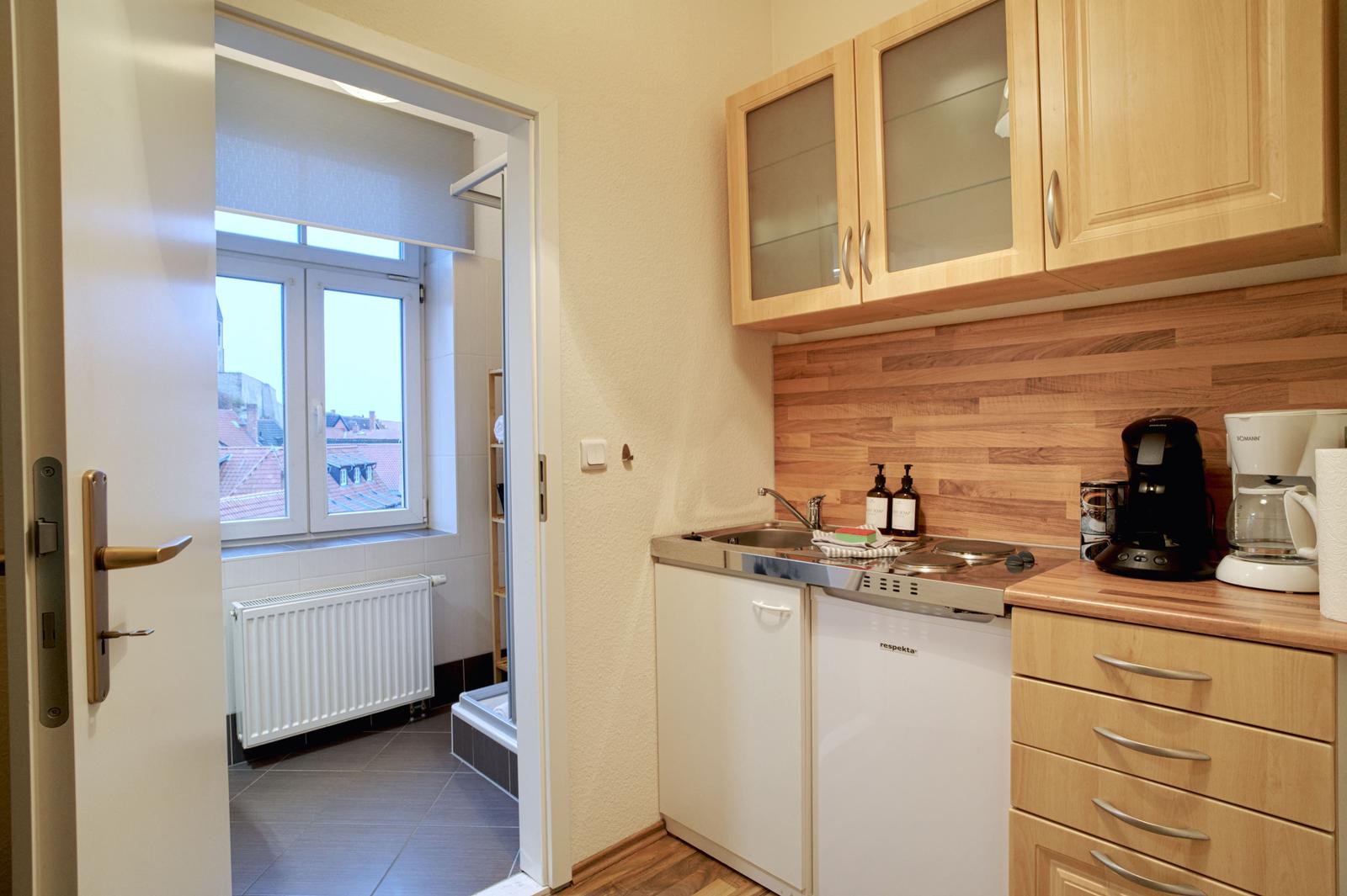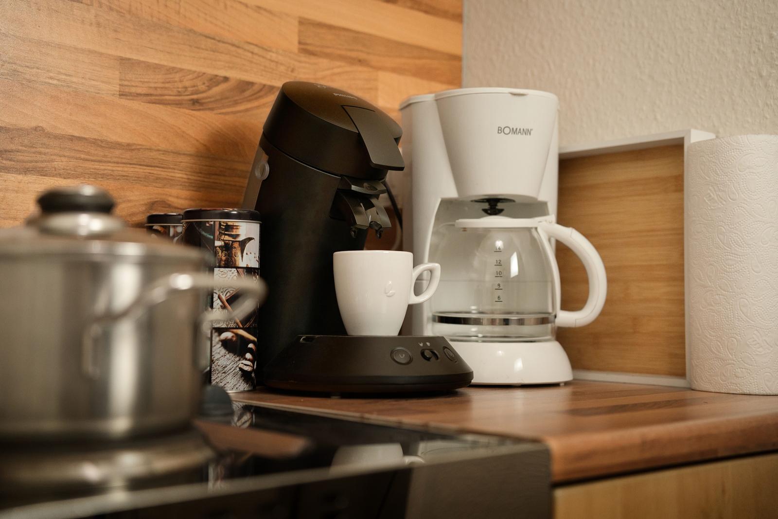 Eine vollständig ausgestattete Küchenzeile – inklusive Kochfeld, Kühlschrank, Kaffeemaschine und allen wichtigen Küchenutensilien – ermöglicht Ihnen eine angenehme Selbstversorgung.