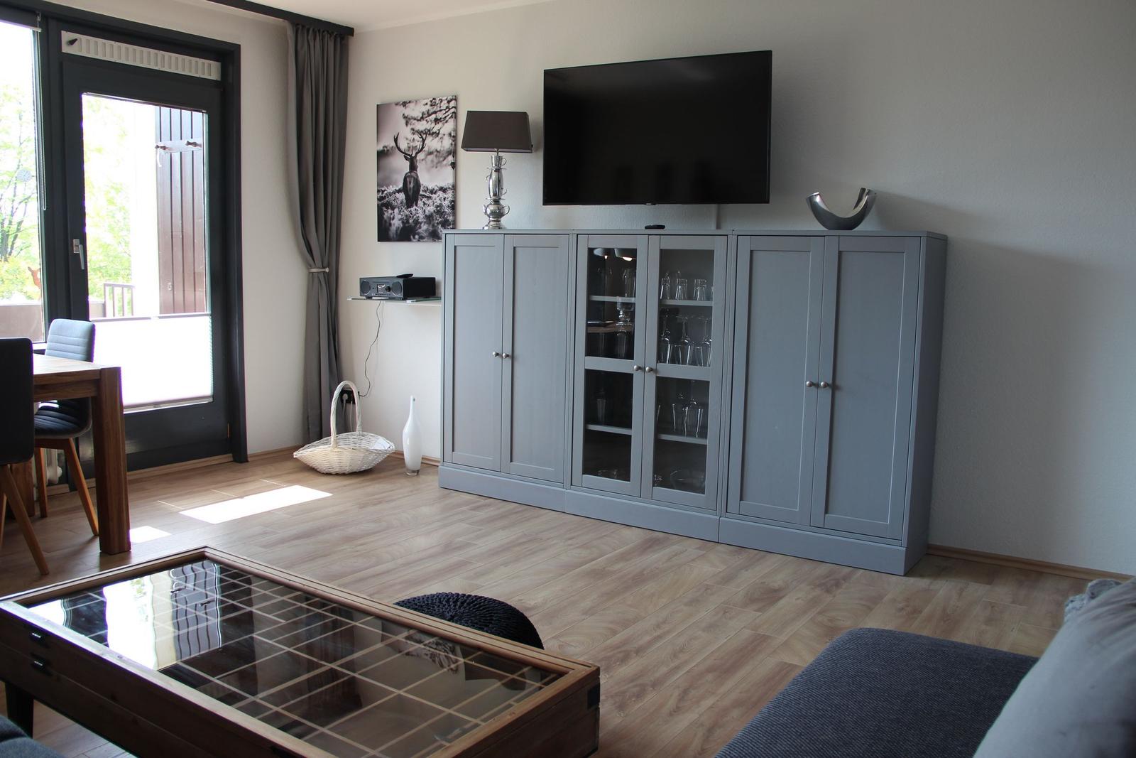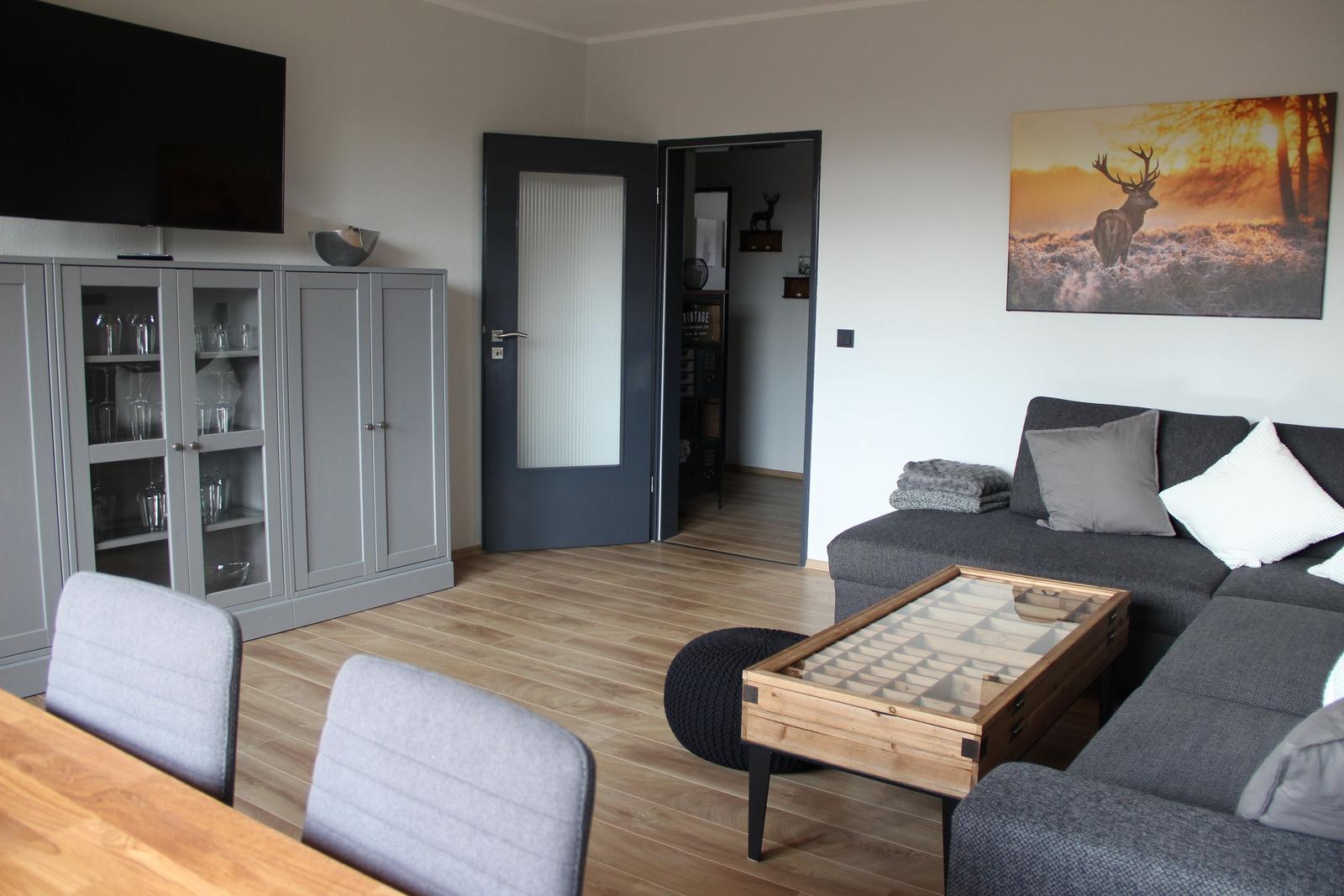 Die Ferienwohnung "Harzbutze 60" bietet eine gemütliche und komfortable Unterkunft für bis zu 4 Personen im Harz. Das kombinierte Wohn-/Esszimmer ist einladend gestaltet und verfügt über ein bequemes Sofa sowie große Fenster, die Tageslicht und Ausblick auf die Natur bieten. Die Küche ist komplett ausgestattet mit Herd, Backofen, Kühlschrank und einem Kaffeevollautomaten, während eine Spülmaschine den Abwasch erleichtert. Eine moderne Badgestaltung mit ebenerdiger Dusche, Waschbecken und WC sorgt für zusätzlichen Komfort. Das Hauptschlafzimmer ist mit einem Doppelbett (180x200) eingerichtet, während das zweite Schlafzimmer ein Queen-Size-Bett bietet. Beide Schlafräume verfügen über ausreichend Stauraum durch Kleiderschränke. Kostenloses WLAN und ein Flachbildfernseher im Wohnzimmer stehen zur Verfügung, um die Abende angenehm zu gestalten. Die Wohnung ist der perfekte Rückzugsort für Erholung und Erkundungstouren im herrlichen Harz.