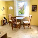 Über einen separaten Eingang gelangen Sie in die helle, moderne Ferienwohnung. Das gemütliche Wohnzimmer haben wir mit einer bequemen Couch, großem LED Fernseher und Esstisch am Fenster ausgestattet. Von hier aus blicken Sie schon beim Frühstück in den schönen Garten. Auch in der Küche finden Sie alles, was man im Urlaub so braucht: Kühlschrank mit Gefrierfach, Backofen, Cerankochfeld, Toaster, Kaffee- und Padmaschine, Mikrowelle, Wasser- und Eierkocher. Küchenrolle, Filtertüten, Zucker, Salz, Tee und Gewürze sind ebenfalls reichlich vorhanden.