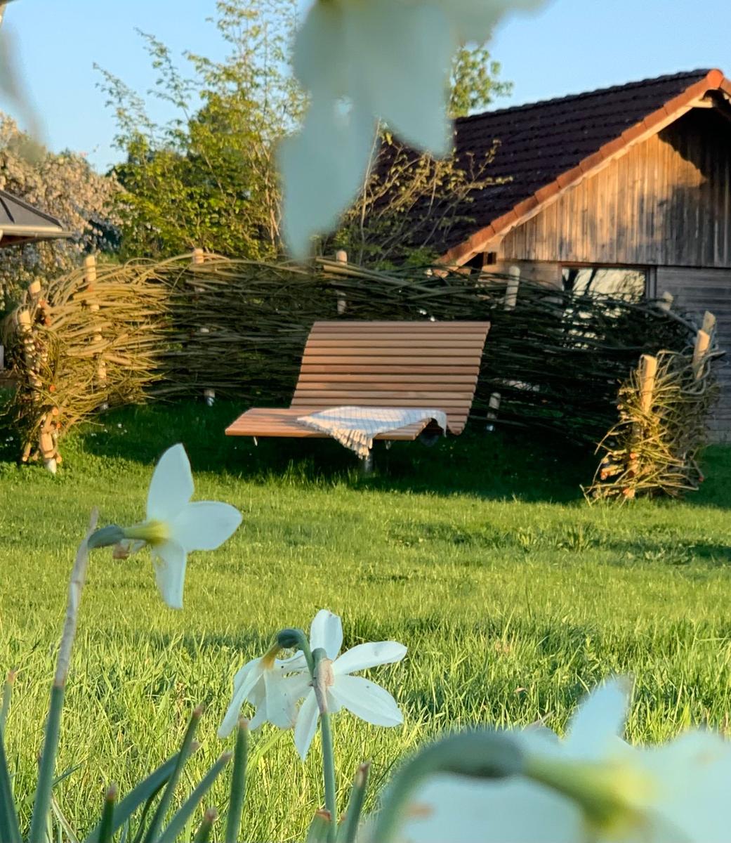 Die gemütliche Eckbank lädt mit dem Rundblick in die Natur zum Verweilen ein.