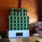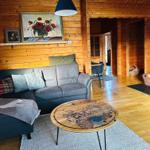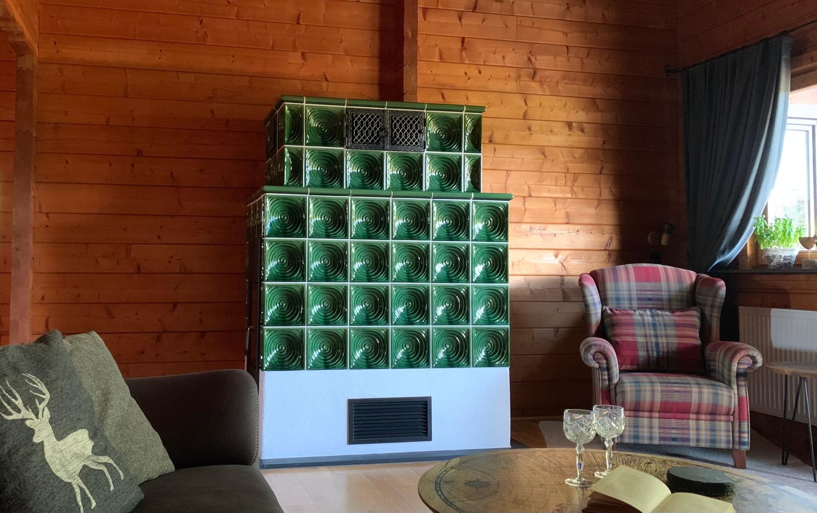 Das Wohnzimmer, mit großem Balkon, Kachelofen und moderner Loungeecke lädt zum