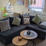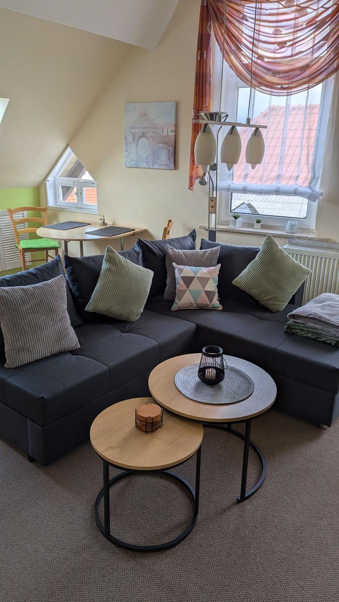 Im Wohnzimmer lädt sie eine kleine Wohnlandschaft zum Relaxen ein. Wird der Couchtisch herangeschoben, ergibt sich zudem eine Liegefläche für kuschelige Filmabende.